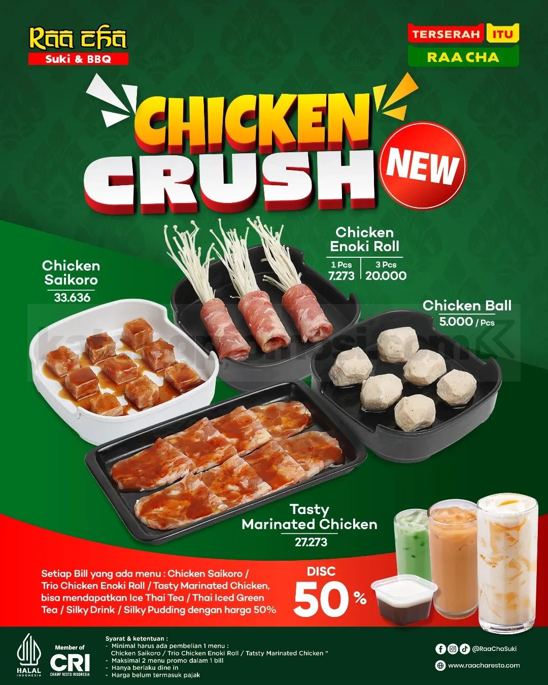 Rasakan sensasi 𝐂𝐇𝐈𝐂𝐊𝐄𝐍 𝐂𝐑𝐔𝐒𝐇! 🔥 Promo Raa Cha Chicken Crush Menu Baru Mulai Rp. 5.000 hadir dengan berbagai pilihan menu yang bikin pengen coba semua: