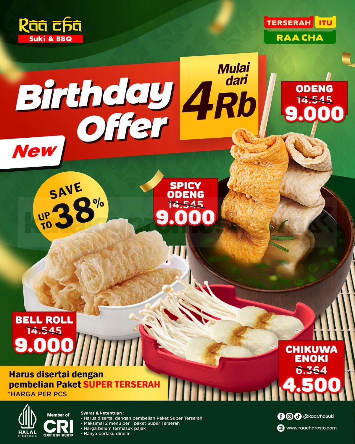 ๐ Cek gambar Promo Raa Cha Suki & BBQ Birthday Offer Mulai Dari 4 Ribu* di bawah ini untuk lihat pilihan menu dan detail harga yang bikin perayaan makin seru!
