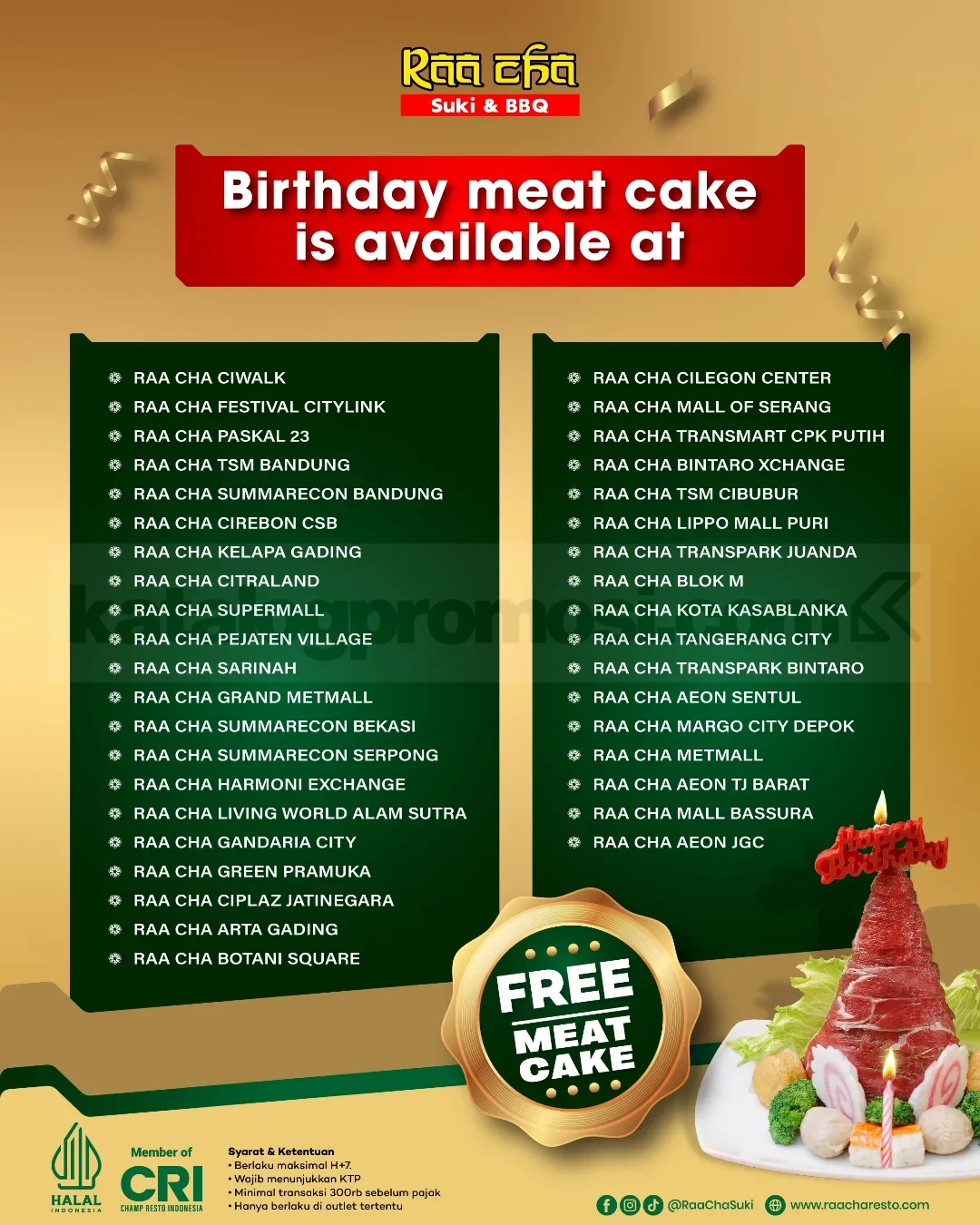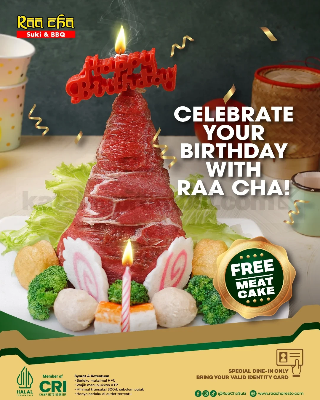 Promo Raa Cha Birthday Treat hadir buat kamu yang ulang tahun! Dapatkan FREE Birthday Meat Cake hanya dengan belanja Rp300.000.