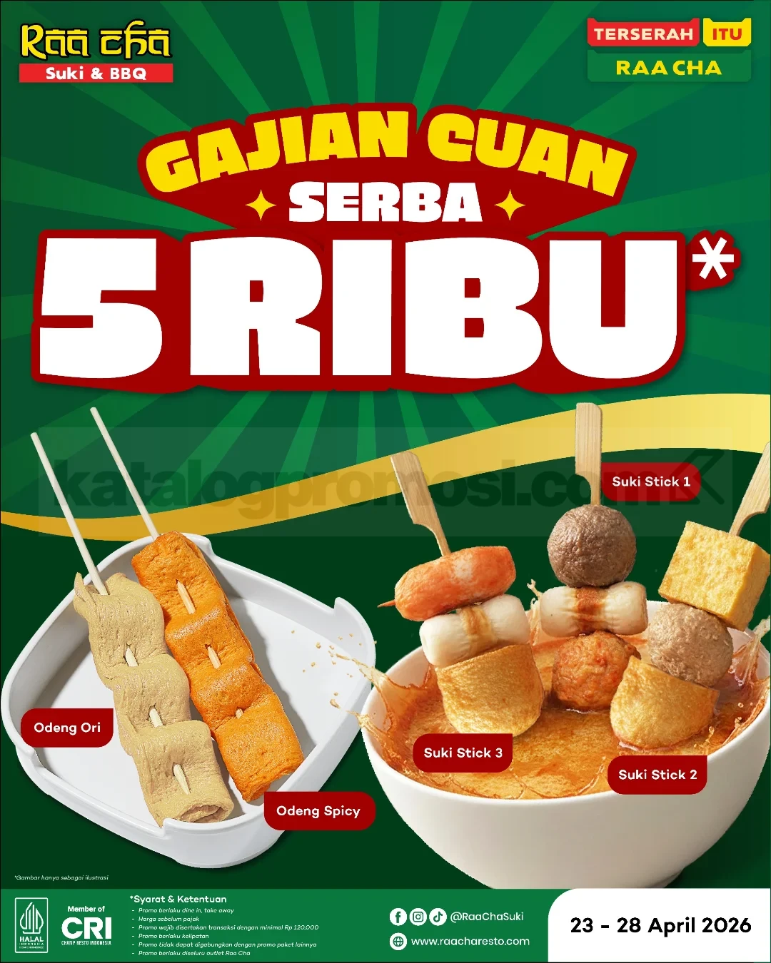 Promo RaaCha Gajian Cuan Serba Rp. 5.000 berlaku tanggal 23 – 28 April 2026 selama periode program berlangsung di seluruh outlet RaaCha.