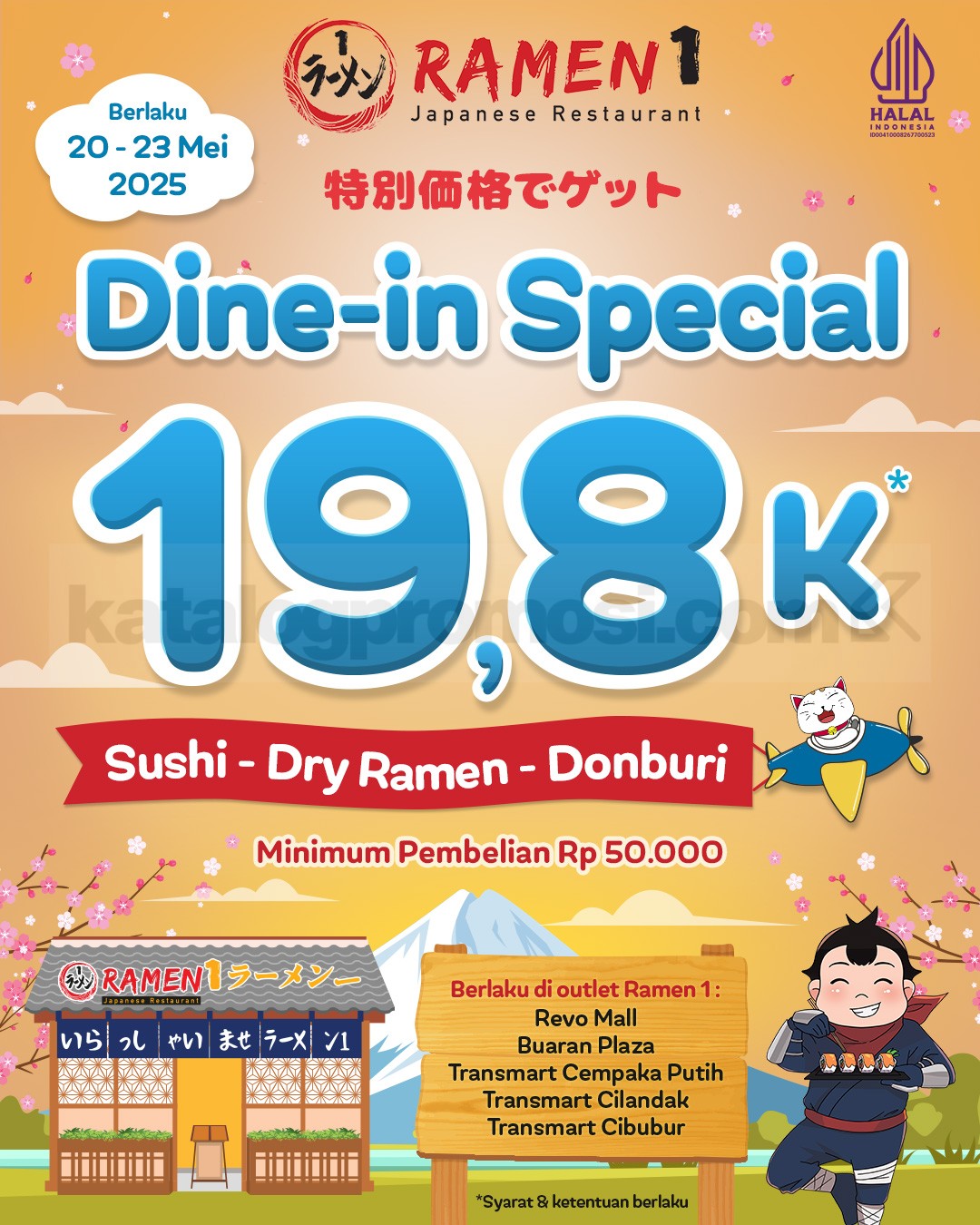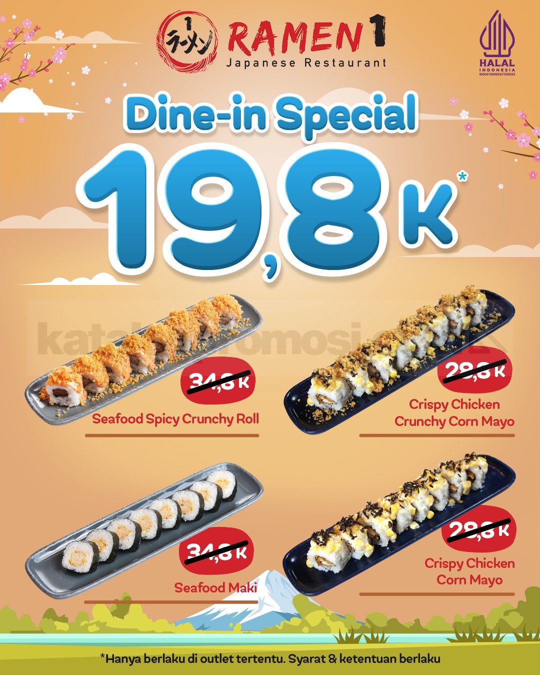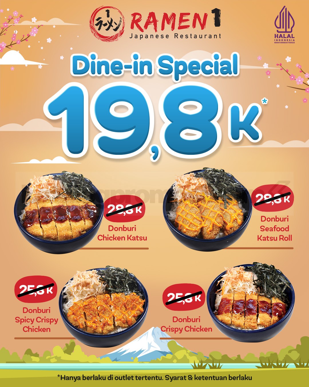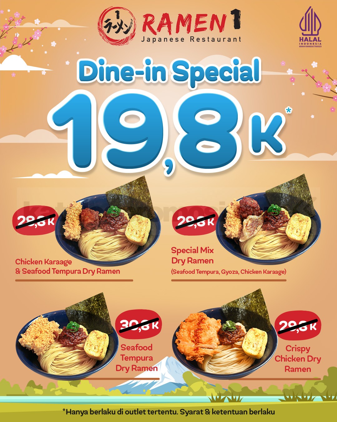 Promo Ramen 1 Spesial Dine-in Menu Favorit cuma Rp19.800 untuk menu Jepang favorit dengan mekanisme repost IG, berlaku di lokasi tertentu.