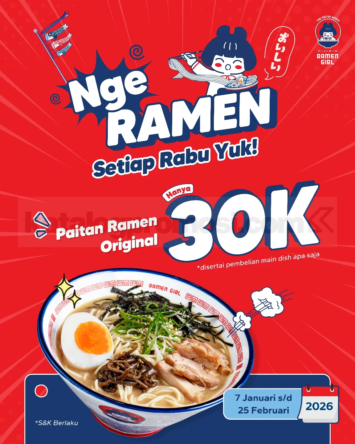 Promo Ramen Girl Paitan Ramen Original Rp. 30.000 dengan beli 1 main dish, kuota terbatas, berlaku mulai tanggal 7 Januari 2026 – 25 Februari 2026 di seluruh outlet.