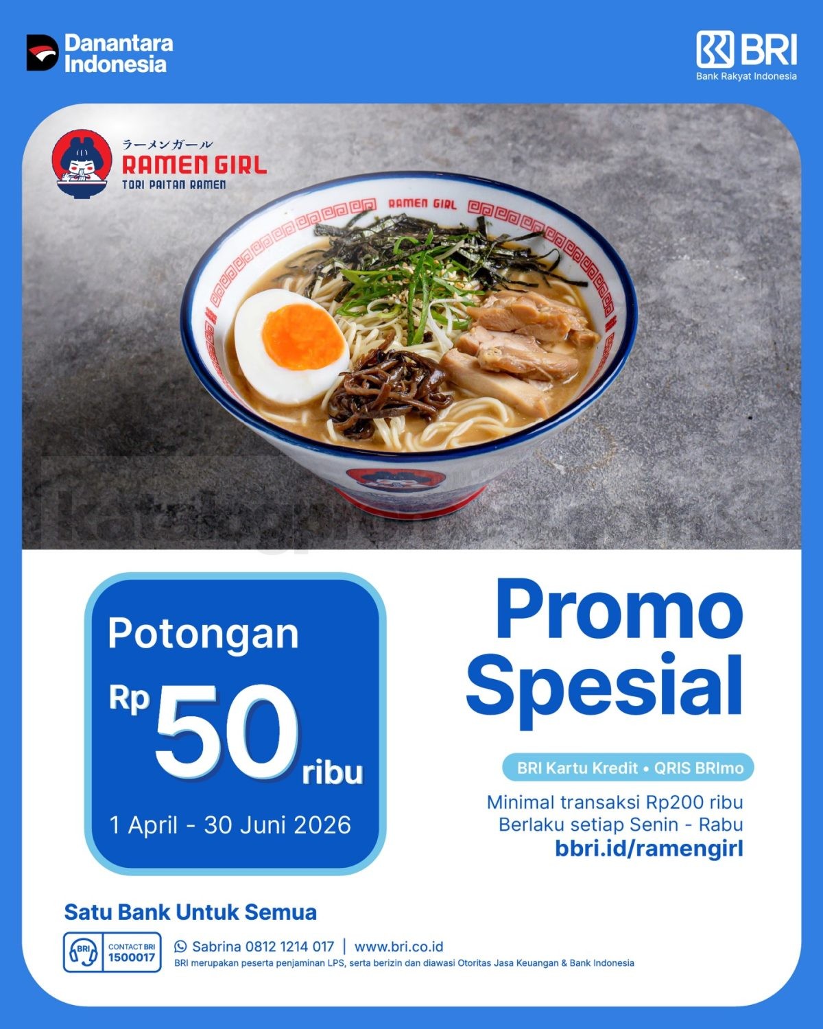 Promo Ramen Girl Spesial BRI Diskon Rp. 50.000 potongan transaksi minimal Rp. 200.000 bayar QRIS BRImo atau kartu kredit BRI berlaku 1 April 2026 – 30 Juni 2026 di seluruh outlet.