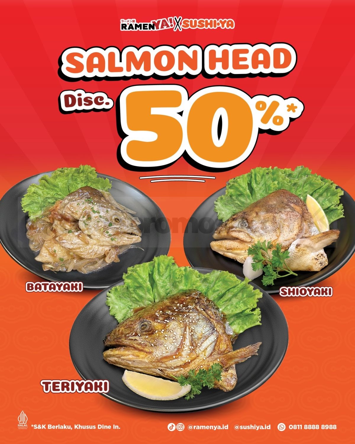Promo RamenYA! x SushiYA Salmon Head Diskon 50% harga mulai Rp. 14.500 periode 1 – 30 Maret 2026 untuk dine in di seluruh outlet RamenYA! x SushiYA dan SushiYA.