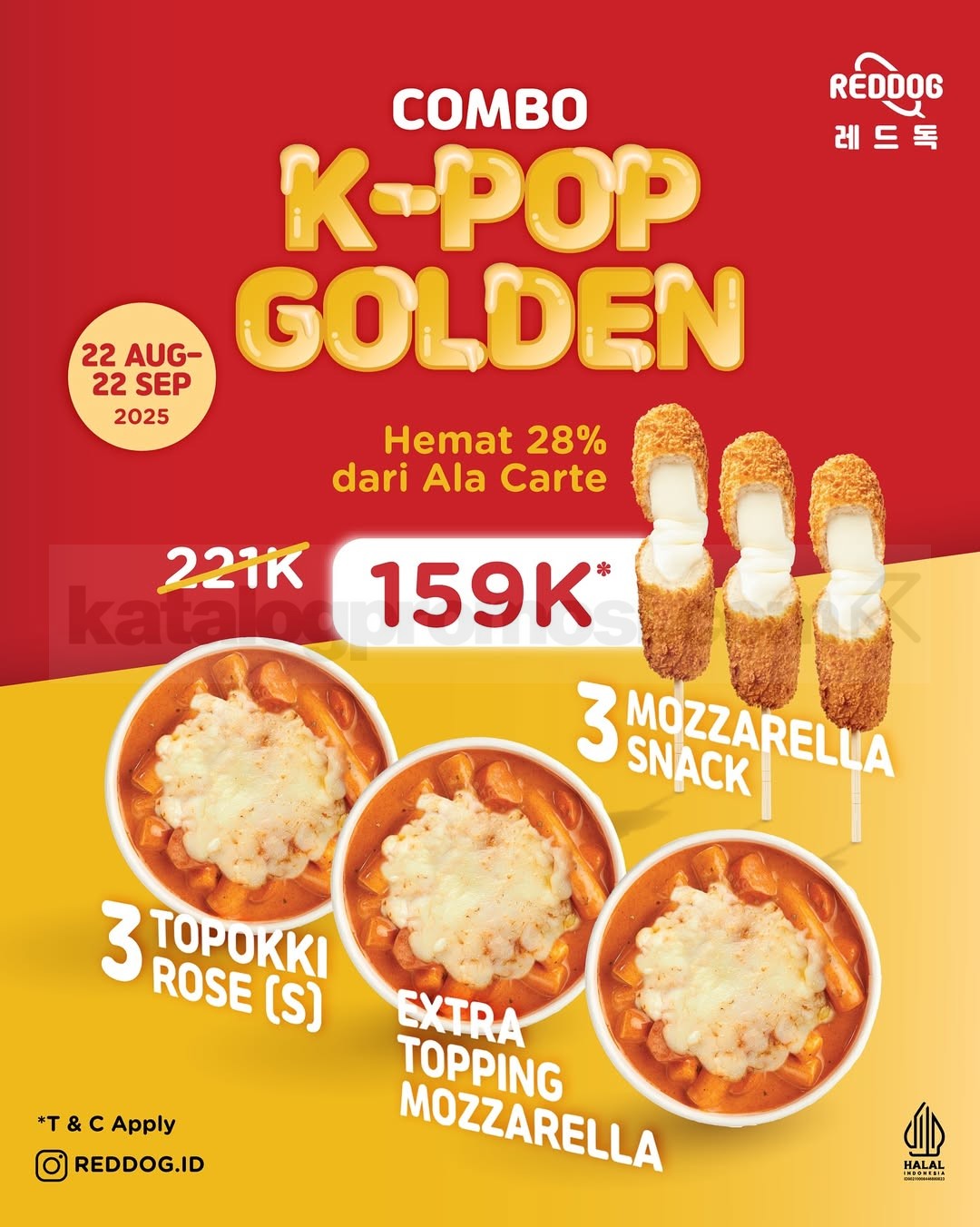 Promo Reddog Combo K-POP Golden cuma Rp159K! Dapatkan 3 topokki rose mozzarella + 3 mozzarella snack. Berlaku s.d 22 September 2025.