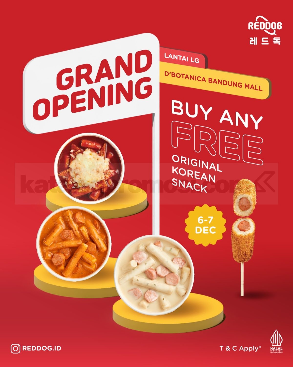 Promo Reddog Grand Opening Bandung Free Korean Snack untuk setiap pembelian menu, berlaku 6 Desember 2025 – 7 Desember 2025 di D’Botanica Bandung.