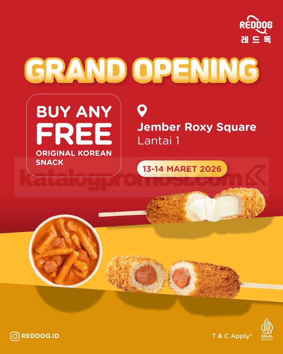 Promo Reddog Grand Opening Jember Free Korean Snack dengan pembelian menu apa saja berlaku mulai tanggal 13 Maret 2026 – 14 Maret 2026 di Jember Roxy Square.
