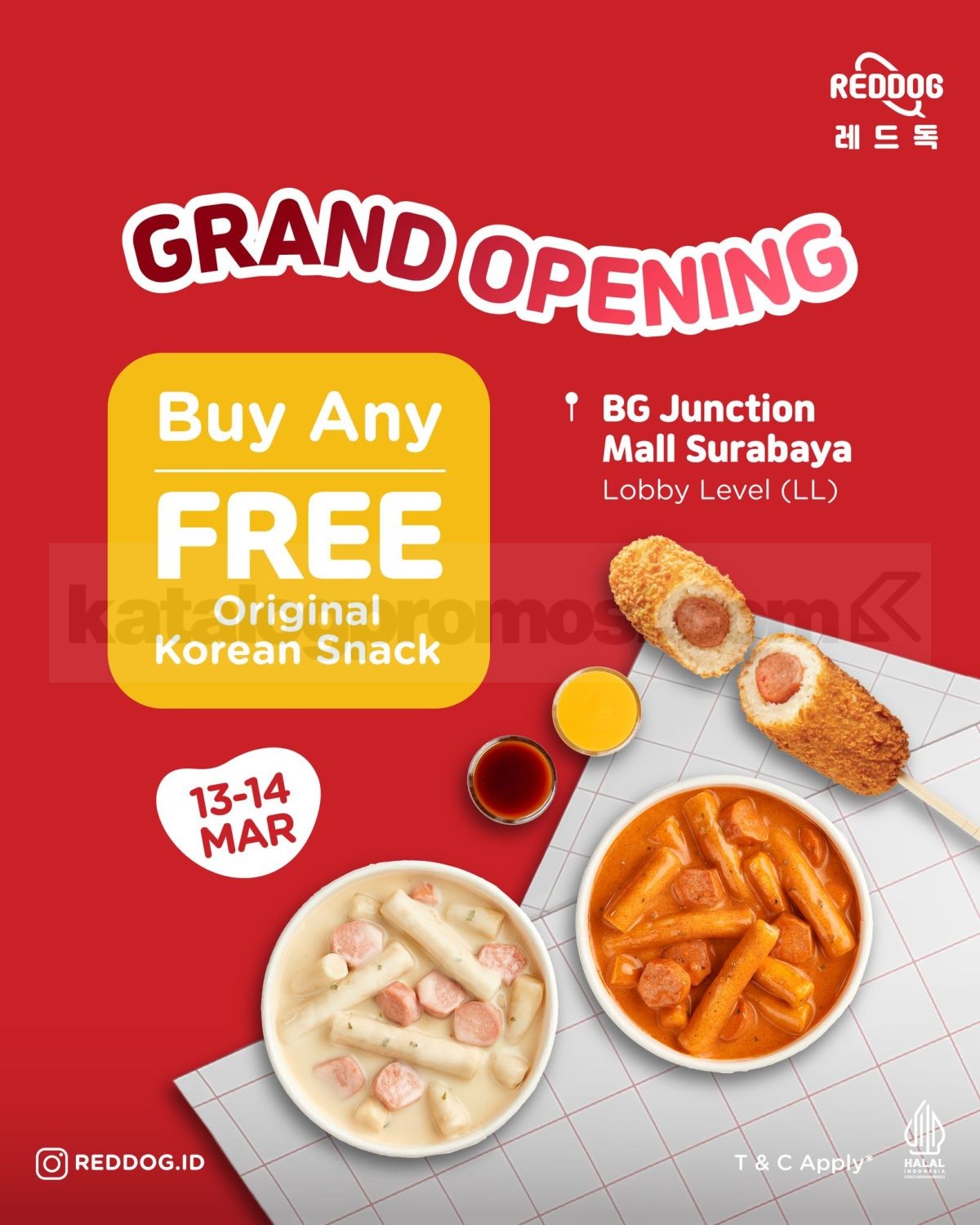 Promo Reddog Grand Opening Surabaya Free Korean Snack bonus 1 Original Korean Snack setiap pembelian menu berlaku mulai tanggal 13-14 Maret 2026 di BG Junction Mall Surabaya.