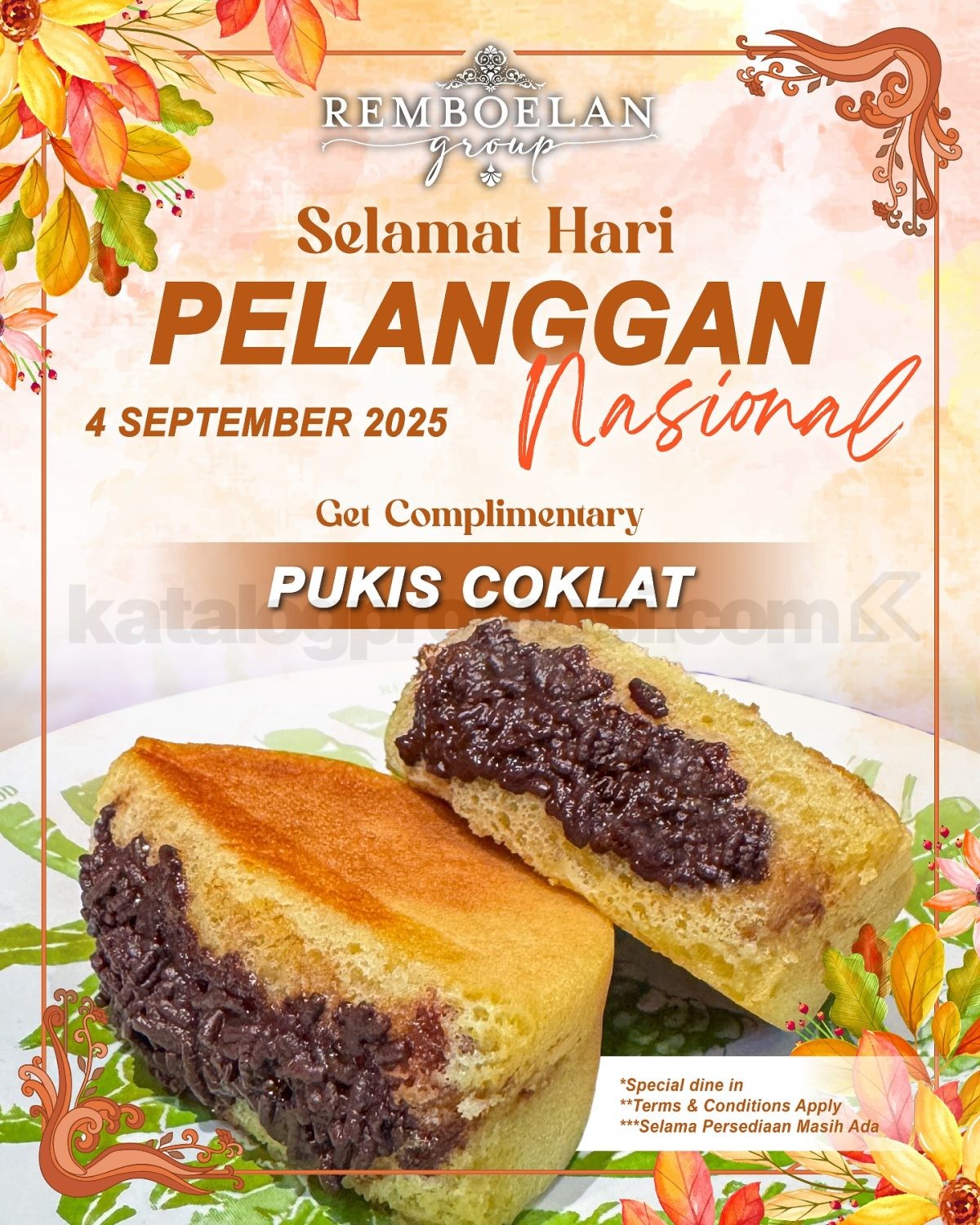 Hai Tambatan Hati yang selalu setia menemani! 🤗 Di Hari Pelanggan Nasional kali ini, Remboelan kasih hadiah spesial buat kamu yang doyan kuliner nusantara. Dengan transaksi minimal Rp250.000, kamu bisa langsung mendapatkan jajanan pasar tradisional legendaris, ✨Pukis Cokelat✨.