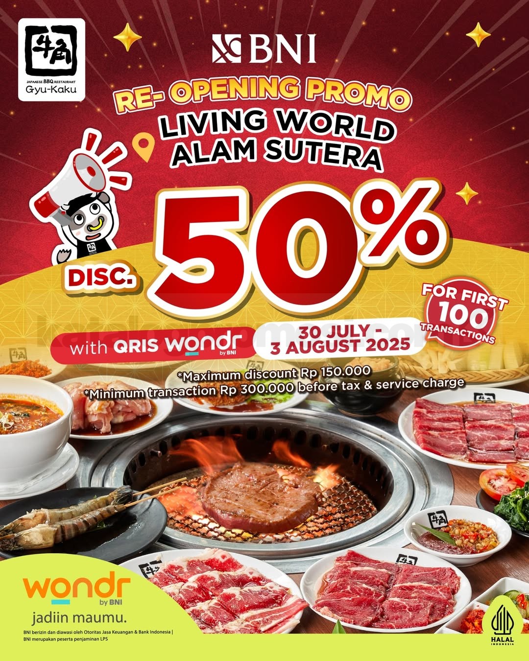 🔥 Diskon 50% dengan pembayaran menggunakan QRIS wondr by BNI, berlaku untuk transaksi minimum Rp. 300.000 sebelum pajak dan servis, dengan potongan maksimal Rp. 150.000. Promo ini hanya berlaku untuk 100 transaksi pertama, jadi pastikan kamu datang lebih awal!