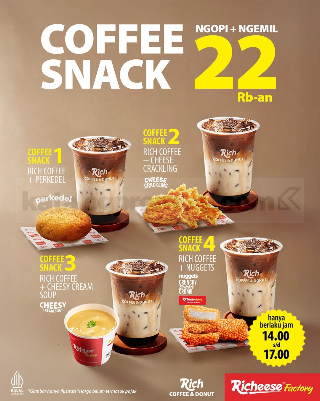 Promo Rich Coffee & Donut Combo Coffee and Snack hadir dengan harga mulai Rp 22.727. Berlaku setiap hari mulai pukul 14.00 – 17.00!