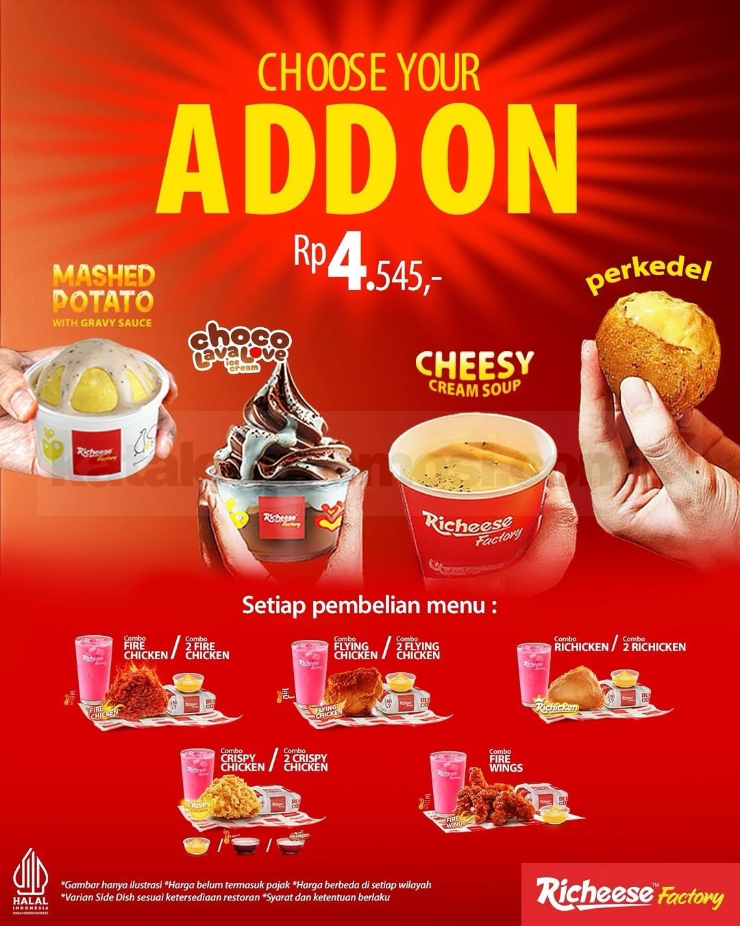 Promo Richeese Factory Add On Side Dish Mulai Rp. 4.545, nikmati menu favorit dengan tambahan Perkedel, Mashed Potato, Cheesy Soup, berlaku di seluruh outlet.