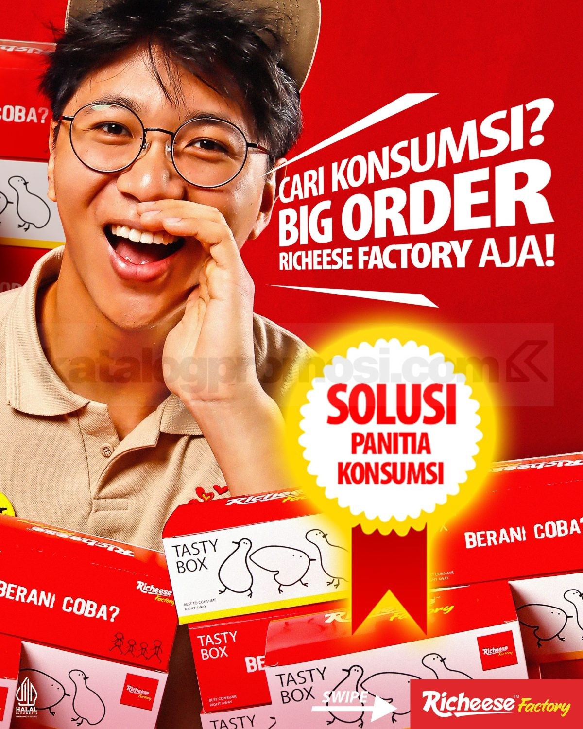 👉 Cek gambar Promo Richeese Factory Big Order mulai Rp. 25.455 di bawah ini untuk lihat detail paket dan harga spesial yang cocok buat kebutuhan konsumsi acara kamu.