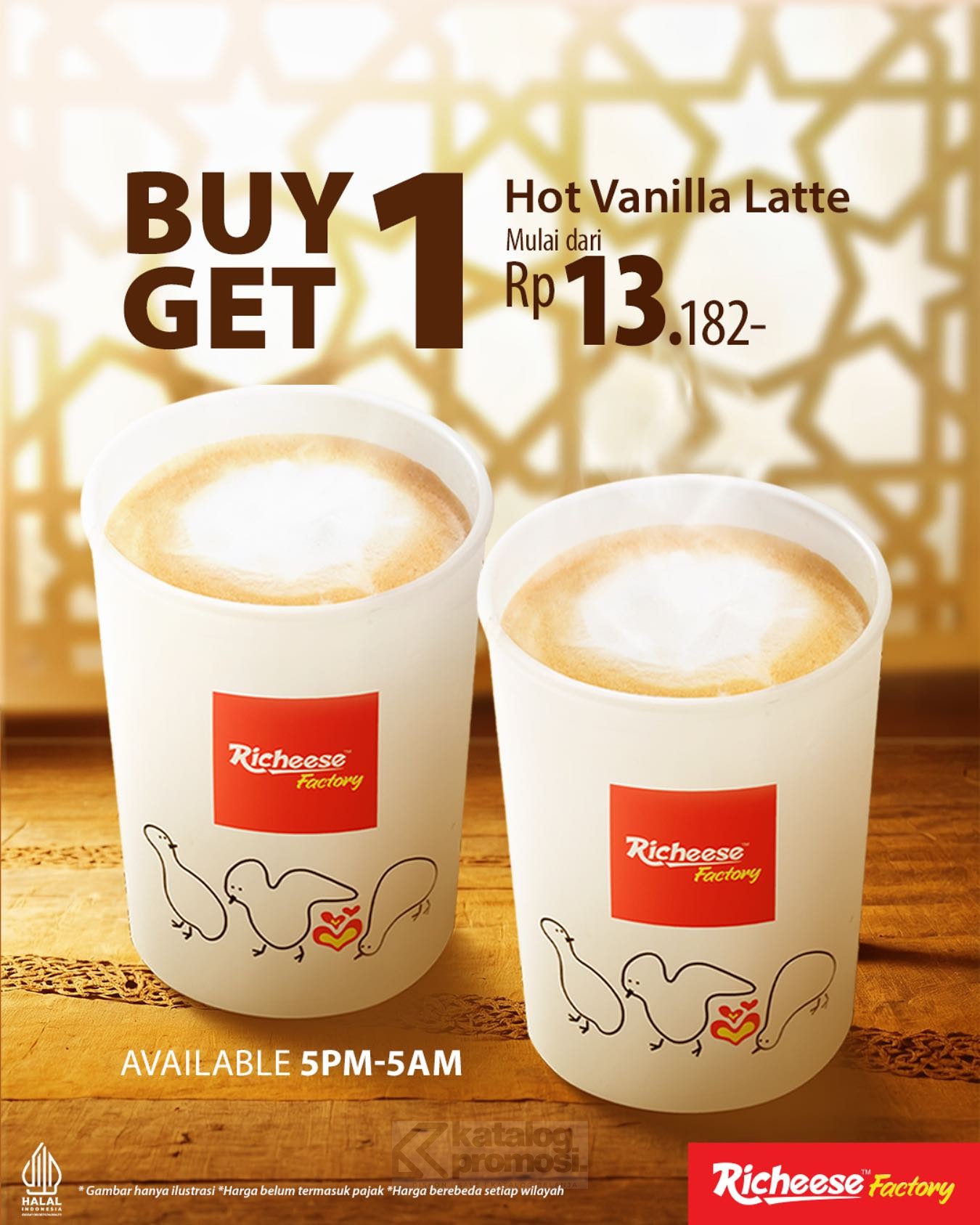 Promo Richeese Factory! Buy 1 Get 1 Hot Vanilla Latte untuk berbuka atau sahur! Berlaku di semua outlet Richeese Factory mulai pukul 5PM – 5AM!