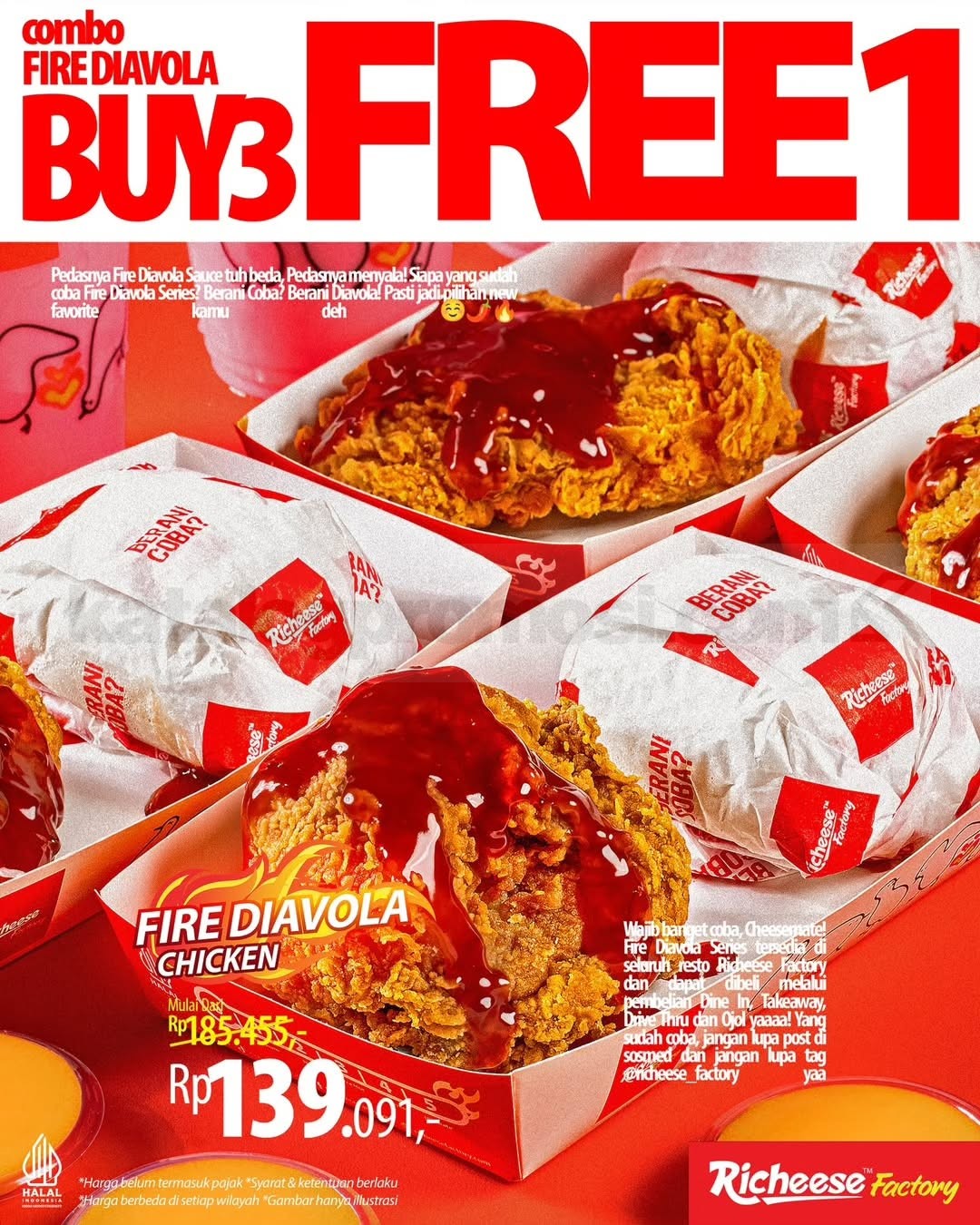 👉 Cek gambar Promo Richeese Factory Buy 3 Free 1 Combo Fire Diavola Chicken Rp. 139.091 di bawah ini untuk lihat detail paket pedasnya 👇