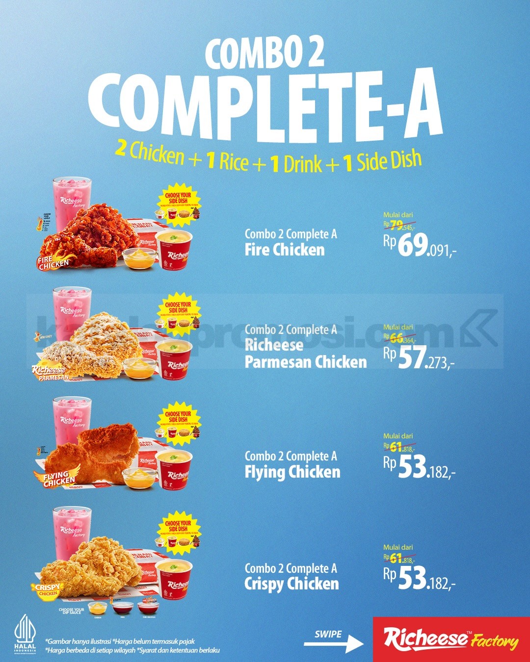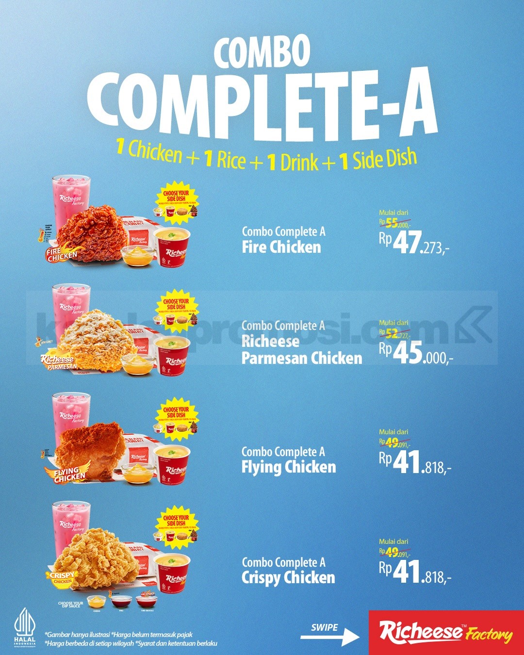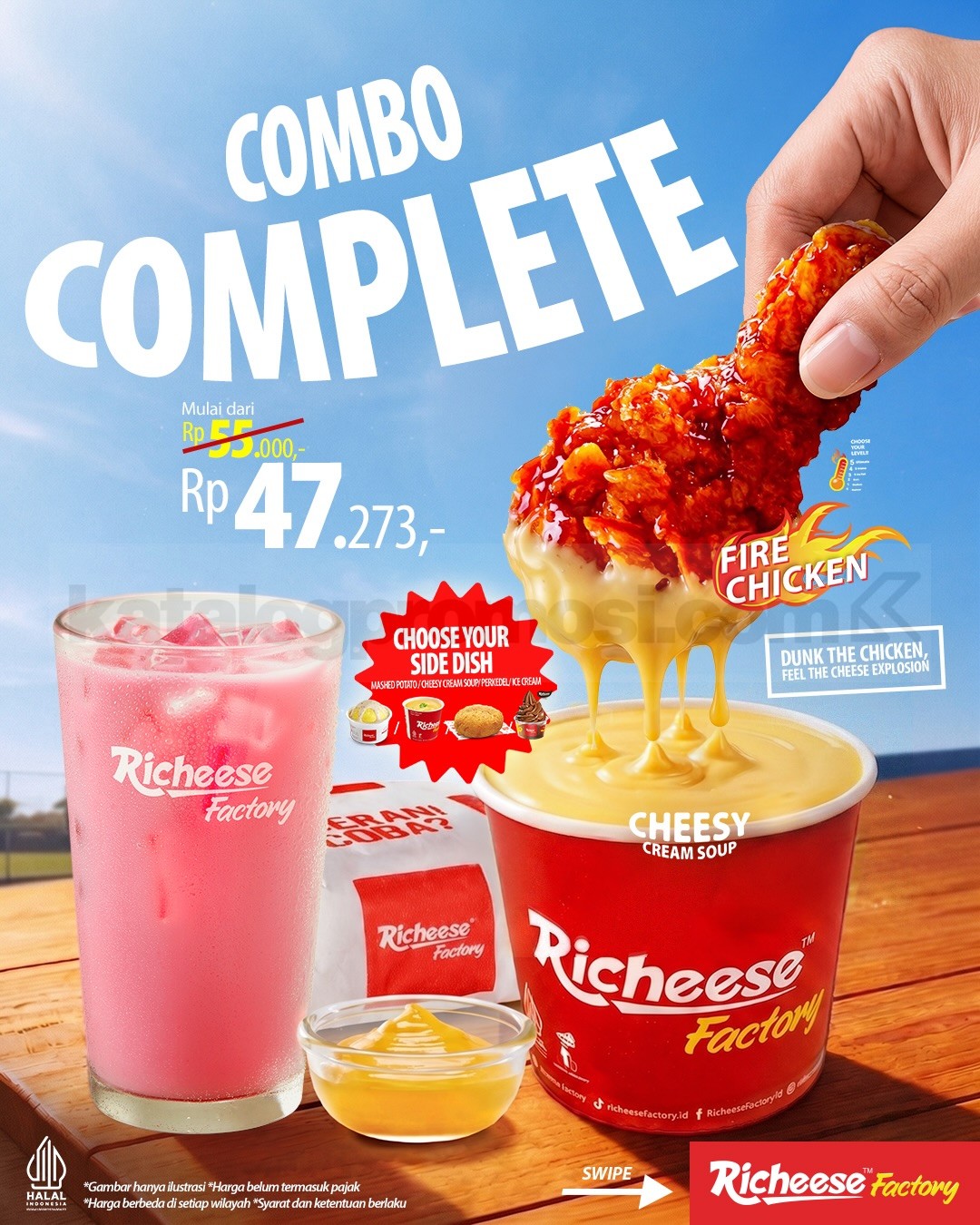 Promo Richeese Factory Combo Complete mulai Rp. 41.818 paket ayam, nasi, minum & side dish berlaku selama periode promo di seluruh outlet.