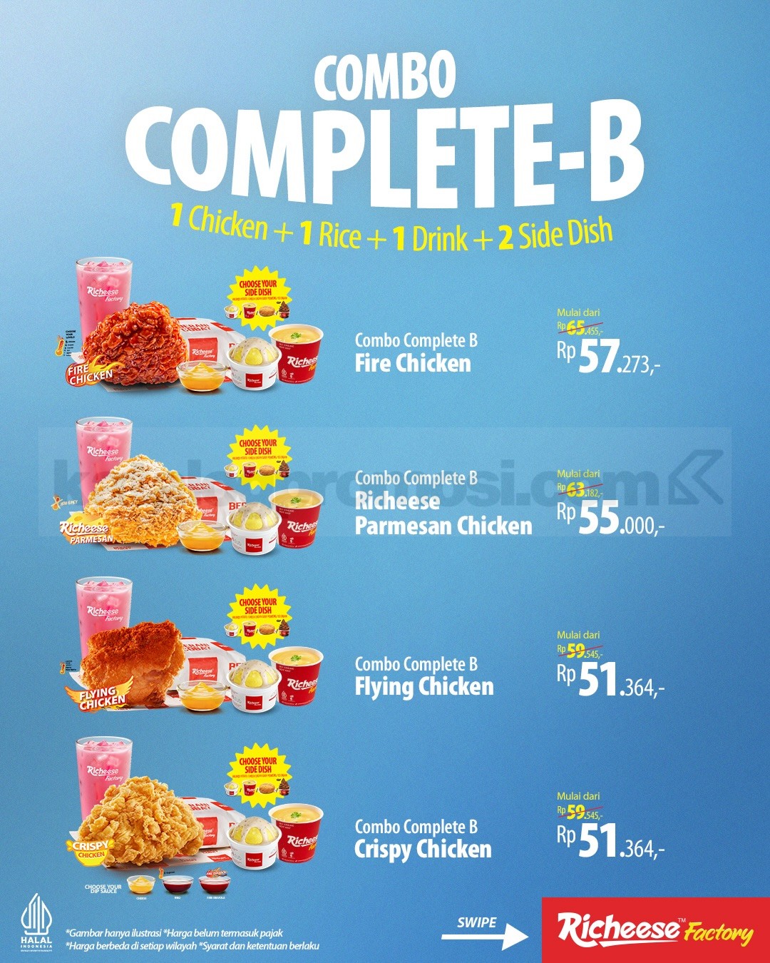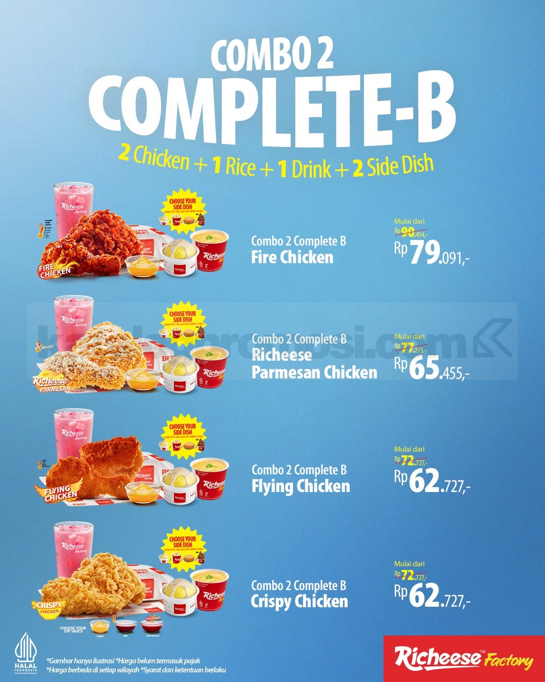Kamu akan mendapatkan 1 potong ayam (pilih Fire Chicken / Richeese Parmesan Chicken / Flying Chicken / Crispy Chicken), 1 nasi putih, 1 minuman, dan 1 side dish pilihan. Harga mulai dari Rp. 41.818 – Rp. 47.273 tergantung varian ayam. - COMBO COMPLETE-B (1 Chicken + 1 Rice + 1 Drink + 2 Side Dish)