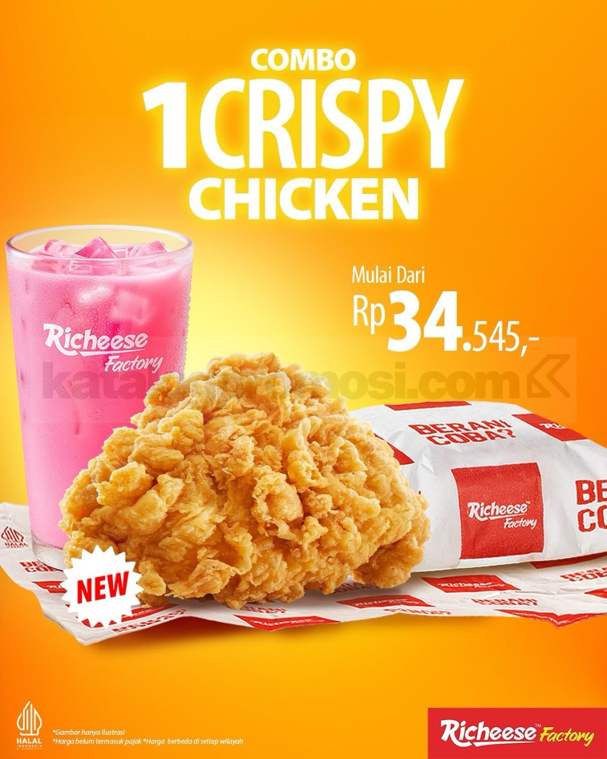 Promo Richeese Factory Combo Crispy Chicken mulai Rp34.545 berisi ayam, nasi, dan minum. Berlaku di seluruh outlet dan pemesanan online selama persediaan masih ada.