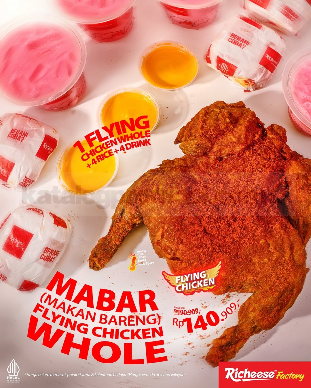 Promo Richeese Factory Combo Mabar Flying Chicken Whole Rp. 140.909 berisi 1 Flying Chicken Whole, 4 nasi, dan 4 minum, berlaku di seluruh resto.
