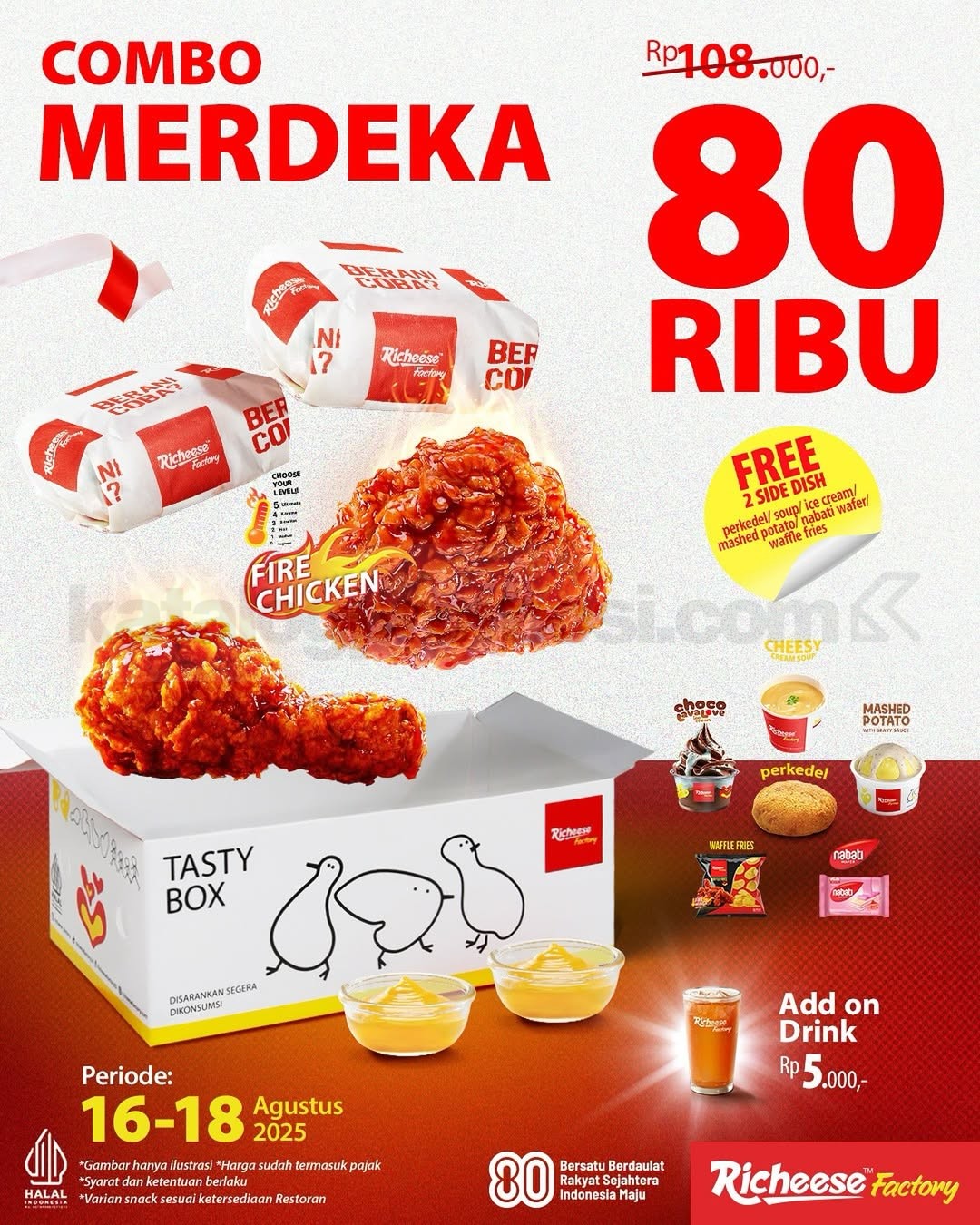 Promo Richeese Factory Combo Merdeka hadirkan paket Fire Chicken lengkap hanya Rp80.000, berlaku mulai tanggal 16โ18 Agustus 2025.