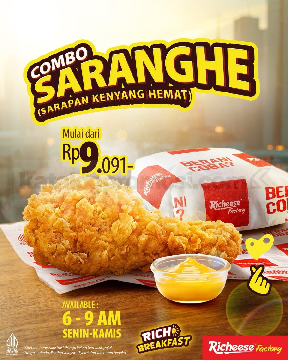 Promo RICHEESE FACTORY Combo SARANGHE mulai dari Rp9.091,- aja. mulai pukul 06.00 sampai 09.00 pagi.