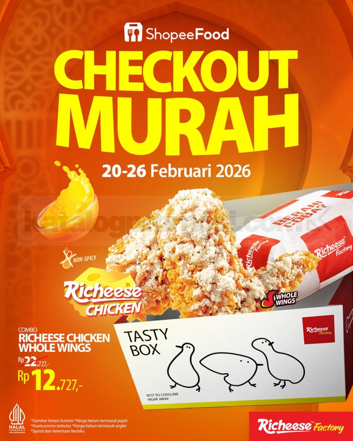 Promo Richeese Factory Combo Whole Wings mulai Rp. 12.727 via ShopeeFood Checkout Murah berlaku mulai tanggal 20 Februari 2026 – 26 Februari 2026 di restoran terpilih