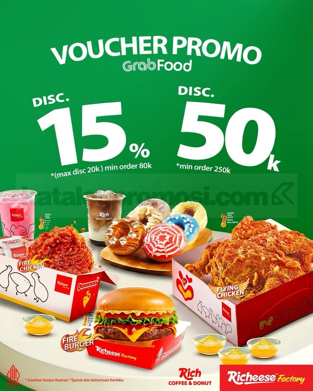 π Cek gambar promo Richeese Factory GrabFood Diskon Hingga Rp.50.000 di bawah ini untuk info lengkapnya!