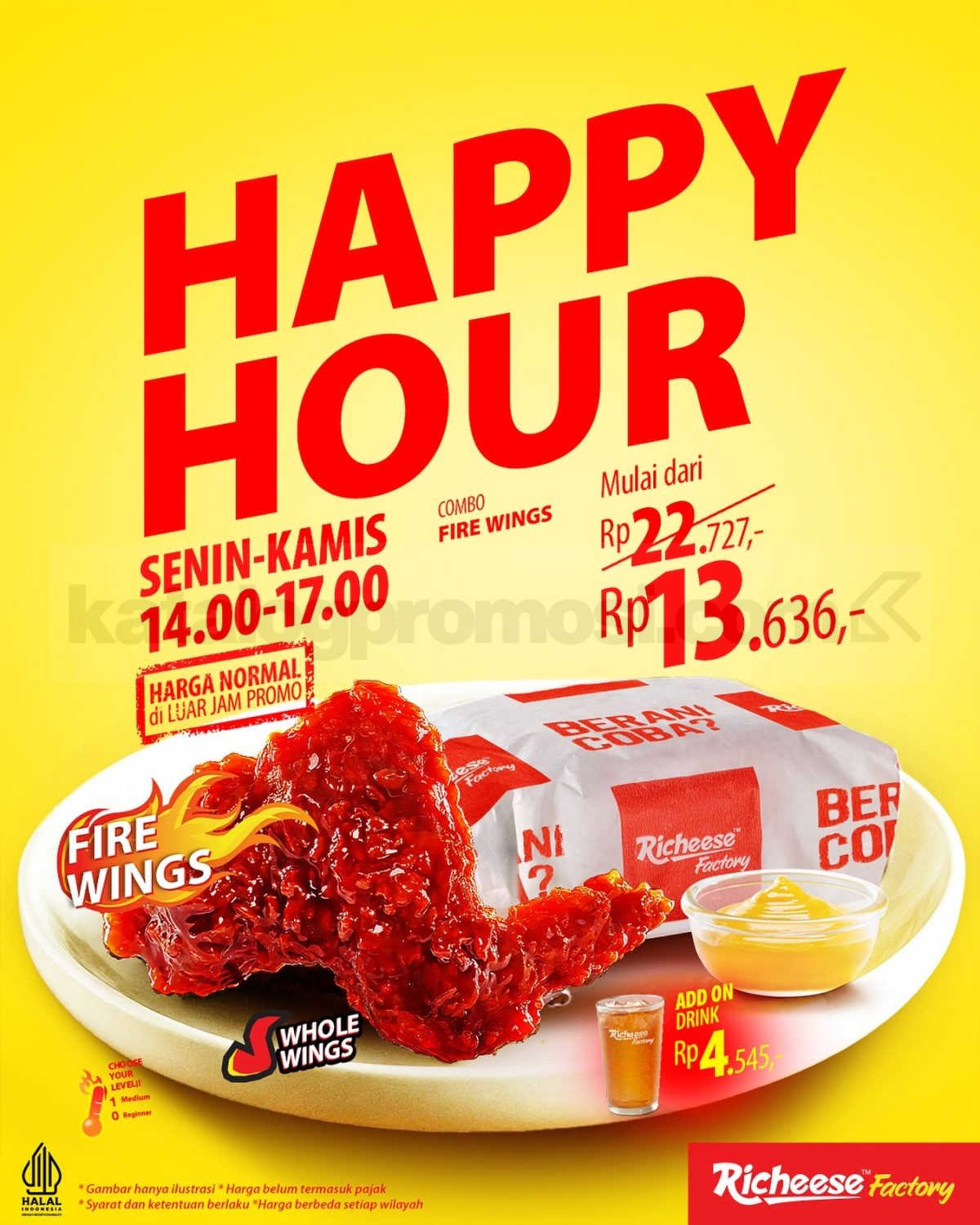 Promo Richeese Factory Happy Hour Combo Fire Wings cuma Rp13.636, berlaku setiap hari Senin–Kamis jam 14.00–17.00 di semua outlet.