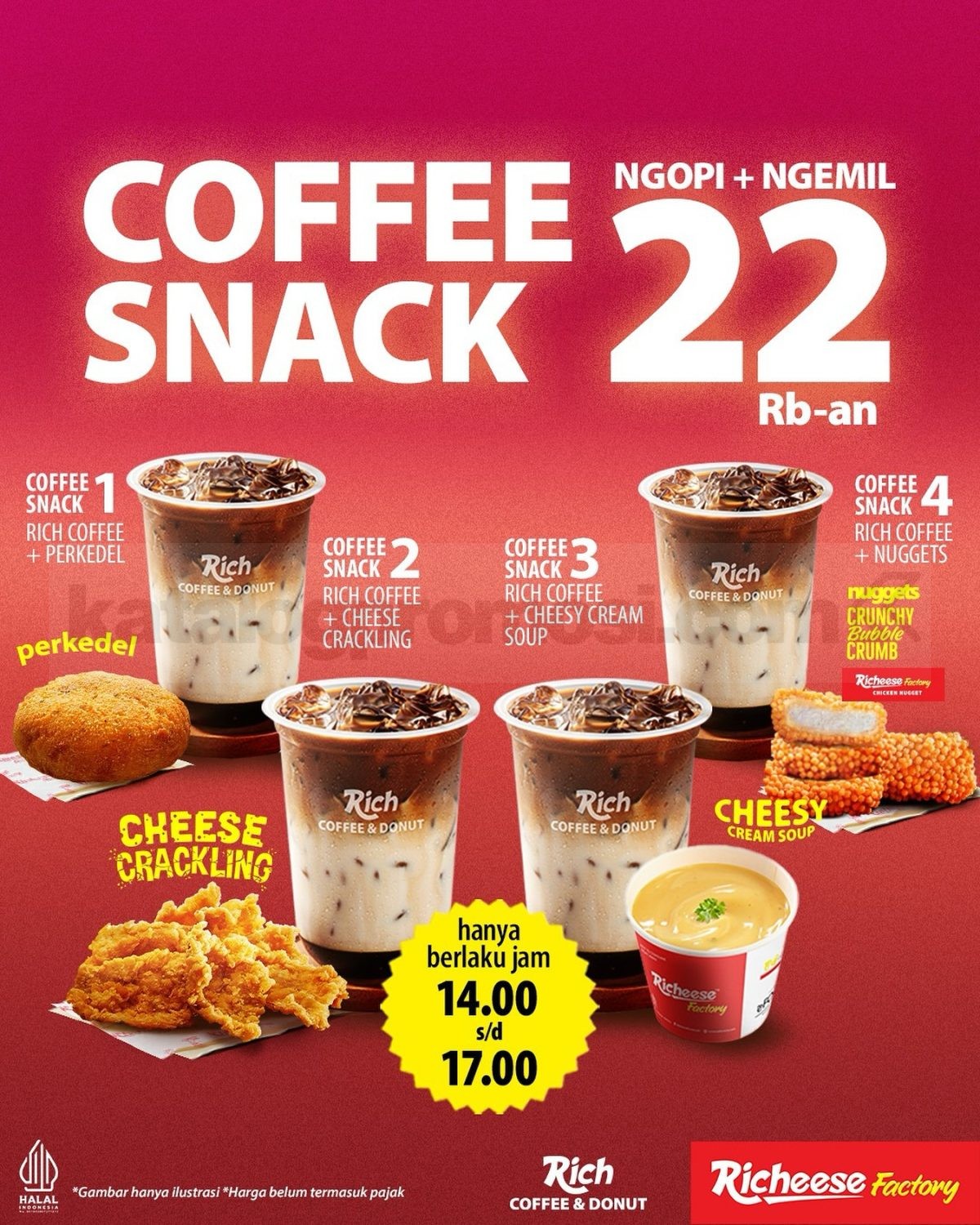 Promo Rich Coffee & Donut Coffee Snack mulai Rp22 ribuan dengan 4 pilihan paket minuman dan snack. Berlaku setiap hari pukul 14.00–17.00 di outlet tertentu.