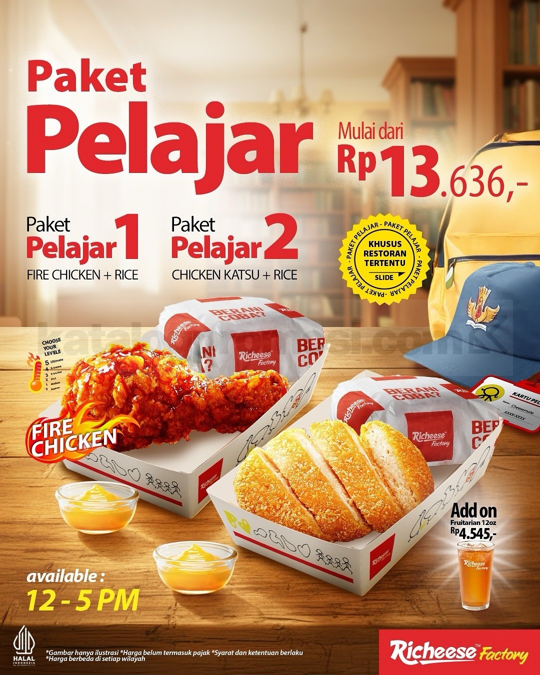 Lagi suntuk nugas? Jangan panik, waktunya recharge mood dan perut bareng Promo Richeese Factory Paket Pelajar yang siap nemenin kamu belajar biar gak makin stress! Cuma tunjukin kartu pelajar atau seragam sekolah, kamu udah bisa nikmatin paket makan enak dengan harga super bersahabat!