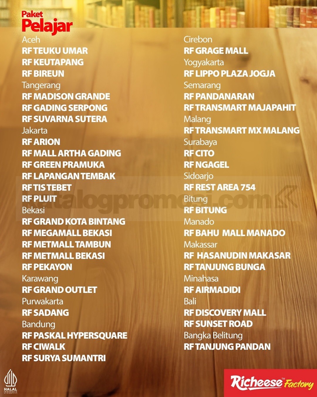 Promo Paket Pelajar Richeese Factory mulai Rp 13.636! Nikmati pilihan menu enak dan minuman tambahan hanya Rp 4.545. Berlaku Senin-Kamis.