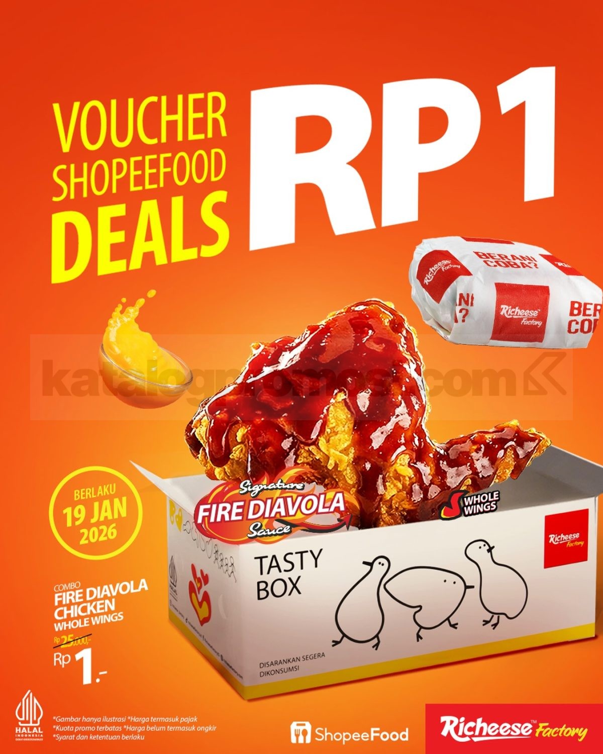 Promo RICHEESE FACTORY ShopeeFood Deals Rp. 1 untuk menu Combo Fire Diavola Whole Wings berlaku hanya 19 Januari 2026 melalui aplikasi ShopeeFood dengan kuota terbatas.