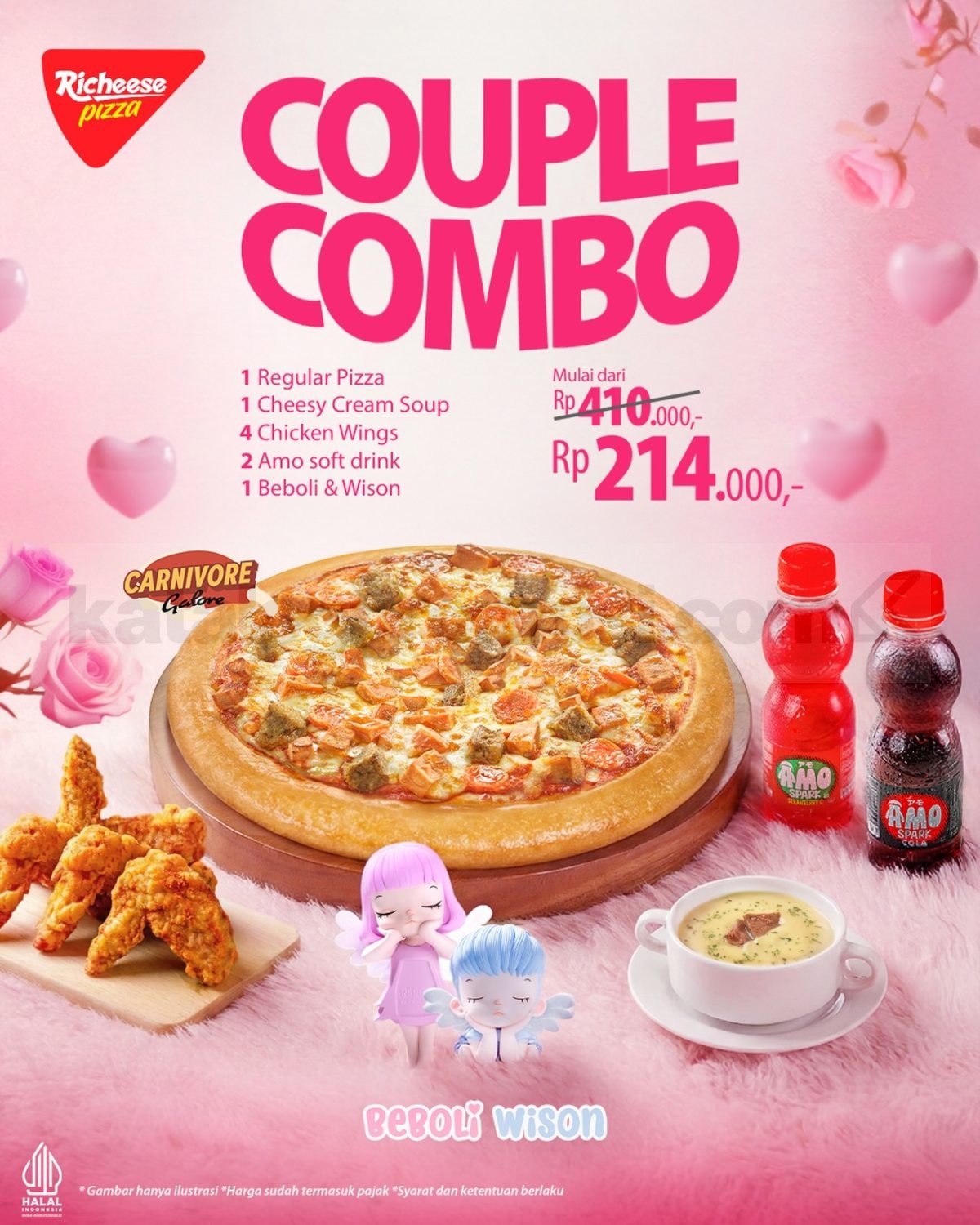 Tidak hanya itu, Promo Richeese Pizza Couple Combo Harga Spesial Rp. 214.000 juga dilengkapi dengan blindbox Beboli & Wison yang bisa menjadi kejutan manis saat menikmati hidangan bersama. Kombinasi menu lengkap dan bonus ini membuat pengalaman makan terasa lebih spesial tanpa perlu memilih menu satu per satu.