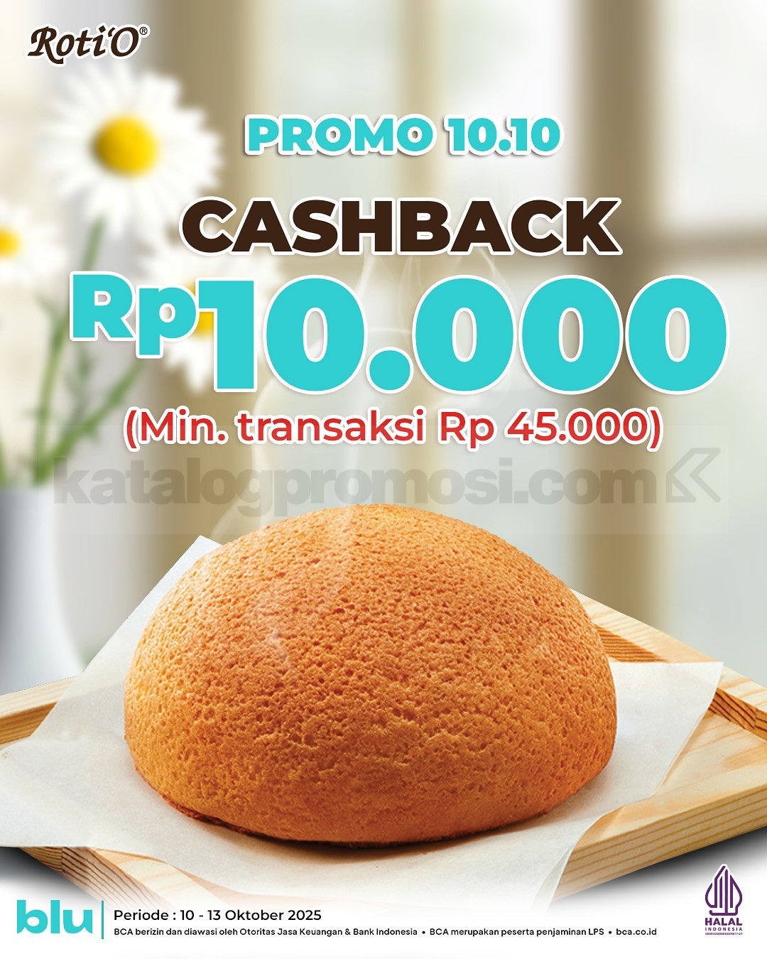 Promo Roti’O 10.10 Cashback Rp. 10.000 dengan Blu by BCA Digital berlaku 10–13 Oktober 2025 di seluruh outlet Roti’O (kecuali bandara & rest area).
