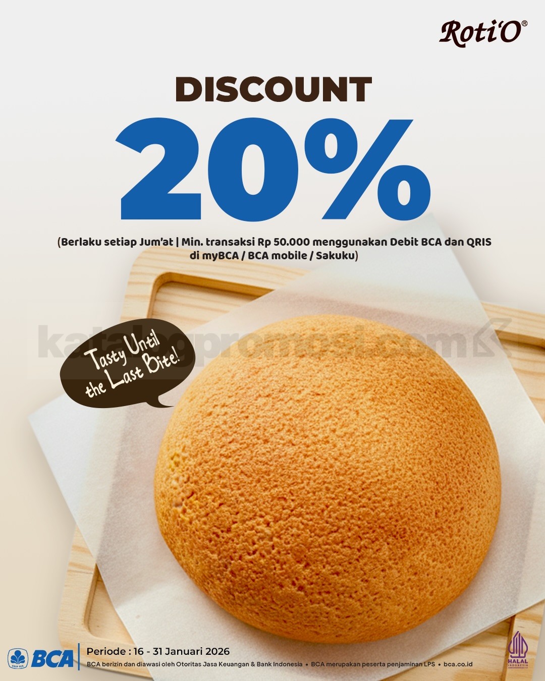 Promo Roti’O Bank Januari Diskon & Cashback hingga 50% dengan pembayaran QRIS dan kartu bank pilihan, transaksi minimal tertentu, berlaku mulai 1-31 Maret 2026 di seluruh outlet.