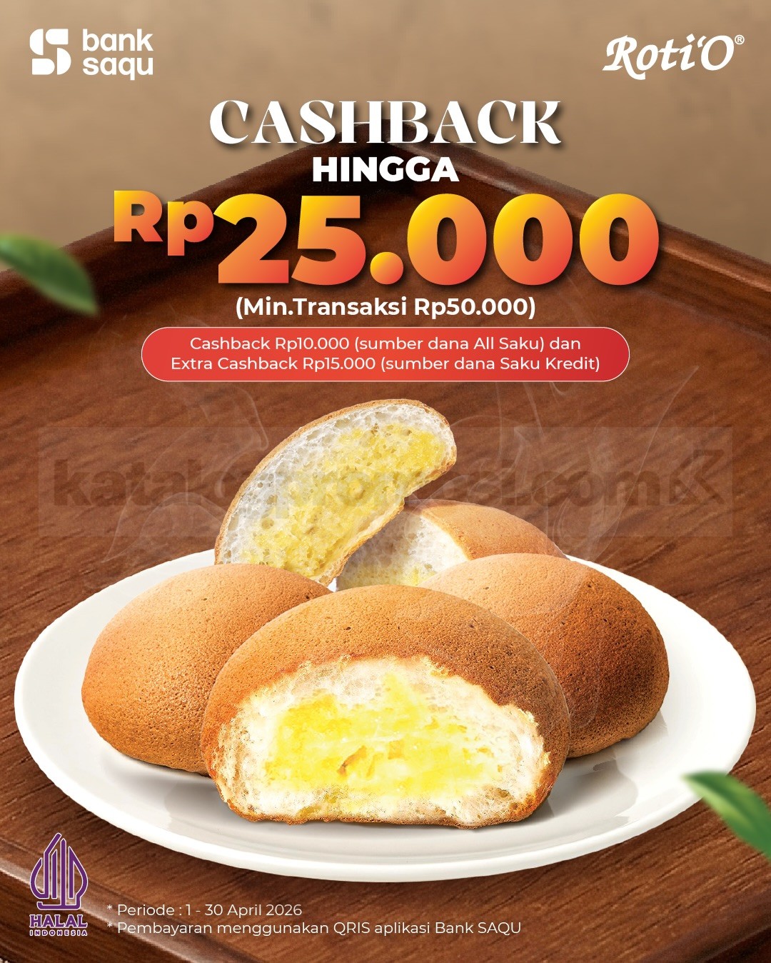 Promo Roti’O Bank Saqu 2 Roti Rp. 9.900 hemat jajan dengan QRIS Bank Saqu dan cashback hingga Rp. 25.000 berlaku 1 April 2026 – 30 April 2026 di seluruh outlet.