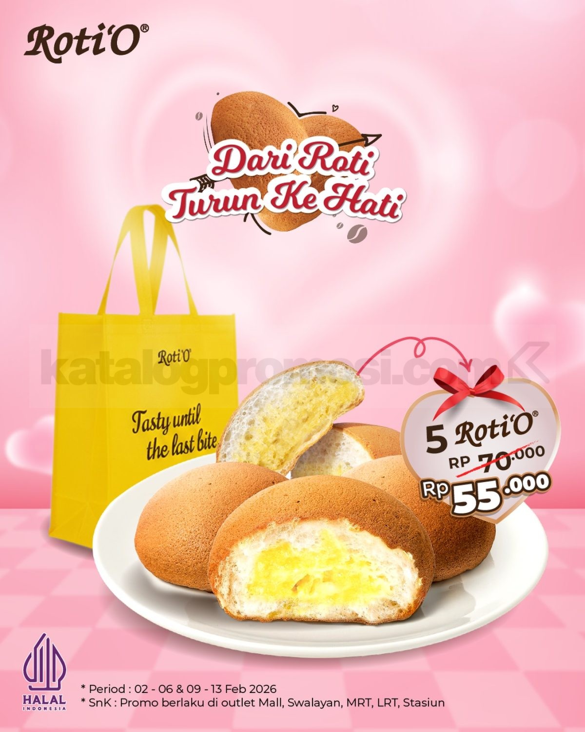 Promo Roti’O Februari 5 Roti’O + Goodie Bag Rp. 55.000 untuk pembelian langsung, cocok berbagi roti hangat, berlaku mulai tanggal 2 Februari 2026 – 13 Februari 2026 di lokasi tertentu.