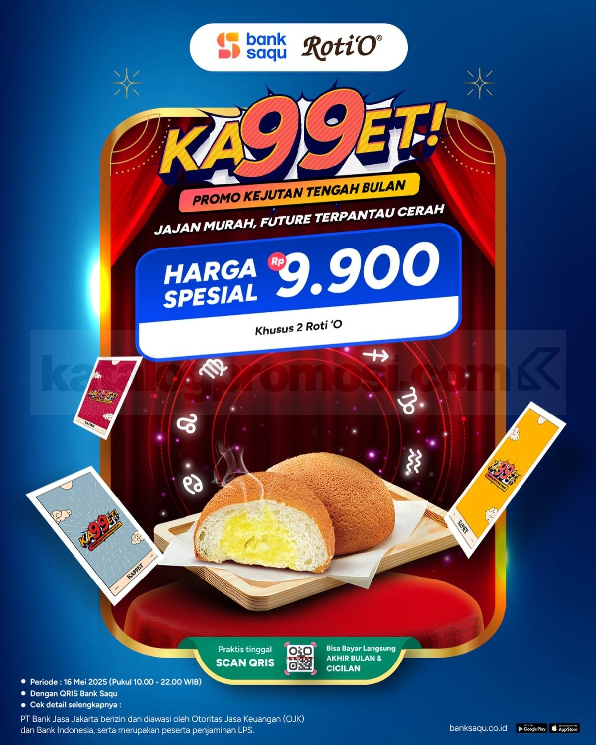 Promo Roti’O Ka99et Bank Saqu Harga Spesial 2 Roti’O hanya Rp 9.900, berlaku hanya di tanggal 16 Mei 2025 pukul 10.00 – 22.00