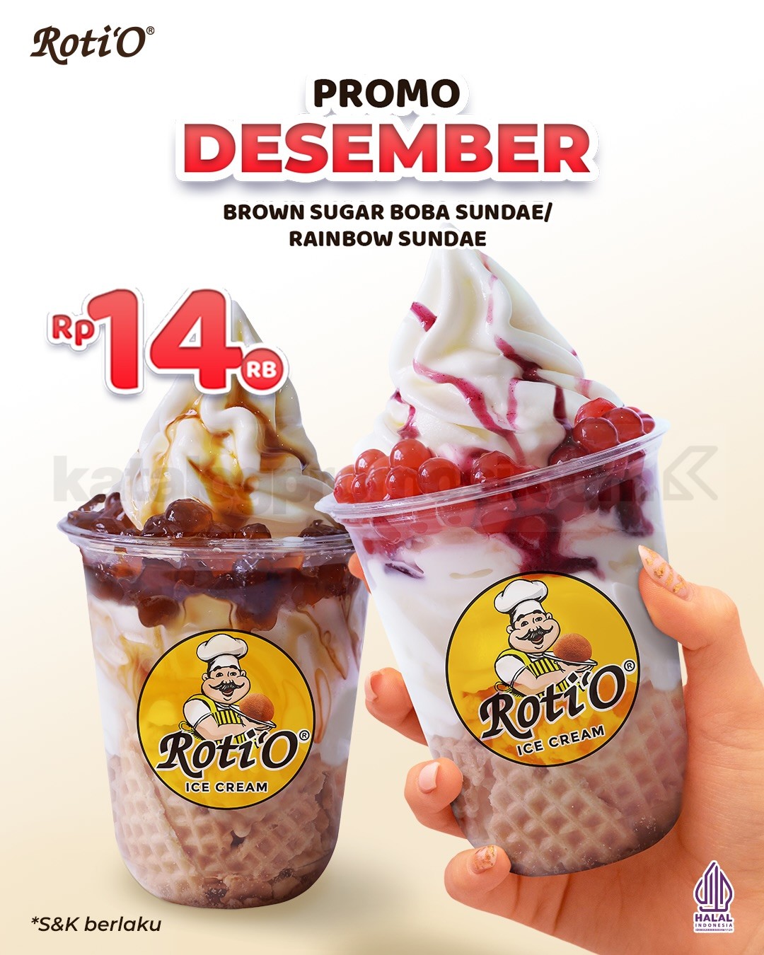 Promo Roti’O Sundae Boba Mulai Rp. 14.000 dengan pilihan topping brown sugar boba atau rainbow boba yang lembut dan creamy, berlaku selama Desember di seluruh outlet.
