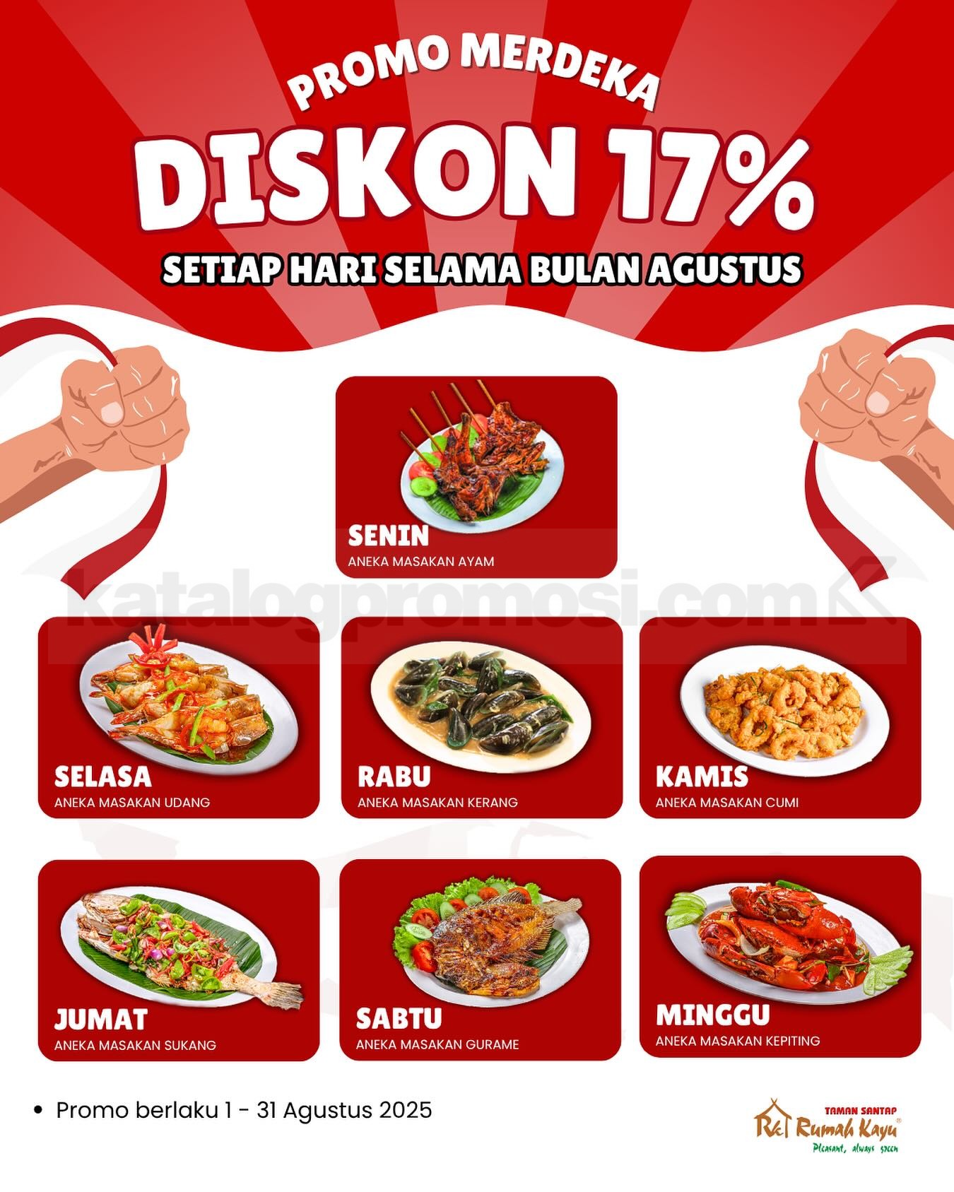 👉 Cek gambar promo Rumah Kayu Agustus Merdeka di bawah ini untuk lihat jadwal menu diskon 17% setiap harinya!