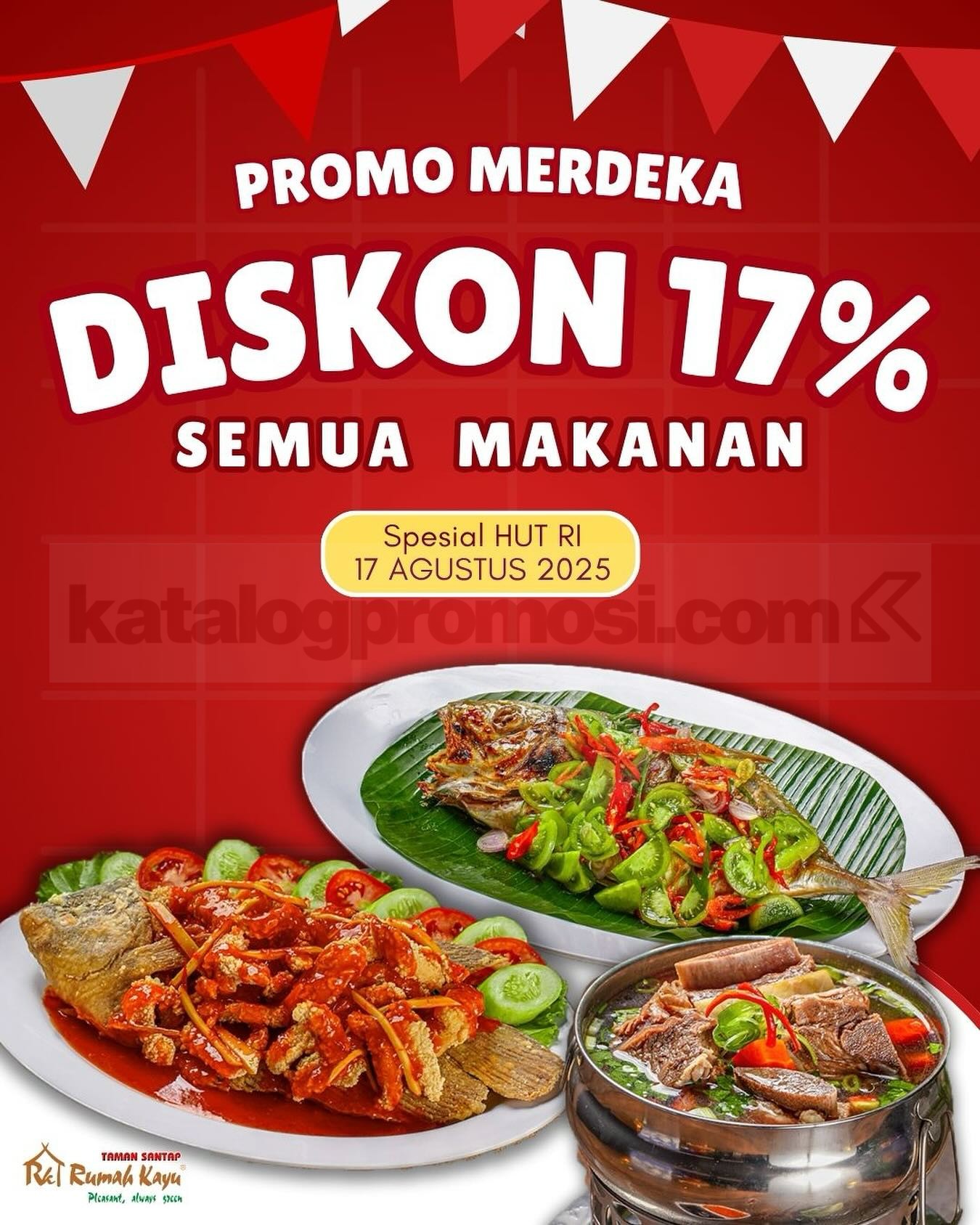Promo Rumah Kayu Serpong Merdeka diskon 17% untuk semua makanan berlaku hanya pada tanggal 17 Agustus 2025 di Gading Serpong.
