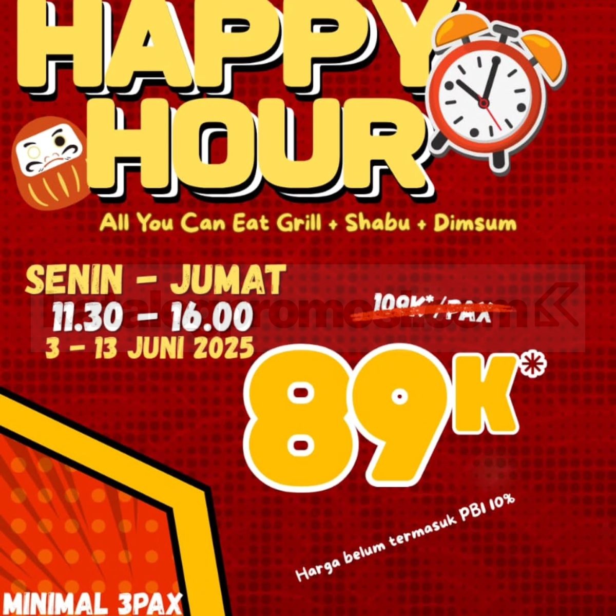 Promo Sakabe Buffet Happy Hour All You Can Eat Grill + Shabu + Dimsum Rp 89K setiap Senin-Jumat jam 11.30-16.00, berlaku 3-13 Juni 2025.