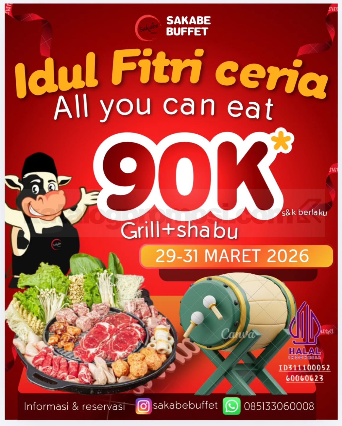 Promo Sakabe Buffet Idul Fitri All You Can Eat Rp. 90.000 makan daging dan minum sepuasnya selama 90 menit berlaku 29 Maret 2026 – 31 Maret 2026.