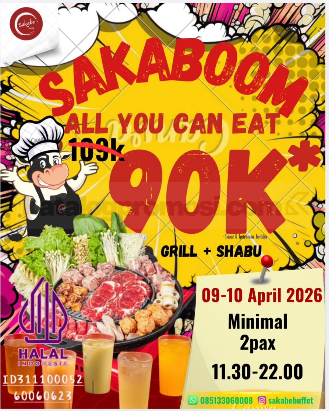 Promo Sakabe Buffet Sakaboom All You Can Eat Rp. 90.000 makan daging dan minum sepuasnya, berlaku mulai tanggal 9 April 2026 – 10 April 2026.