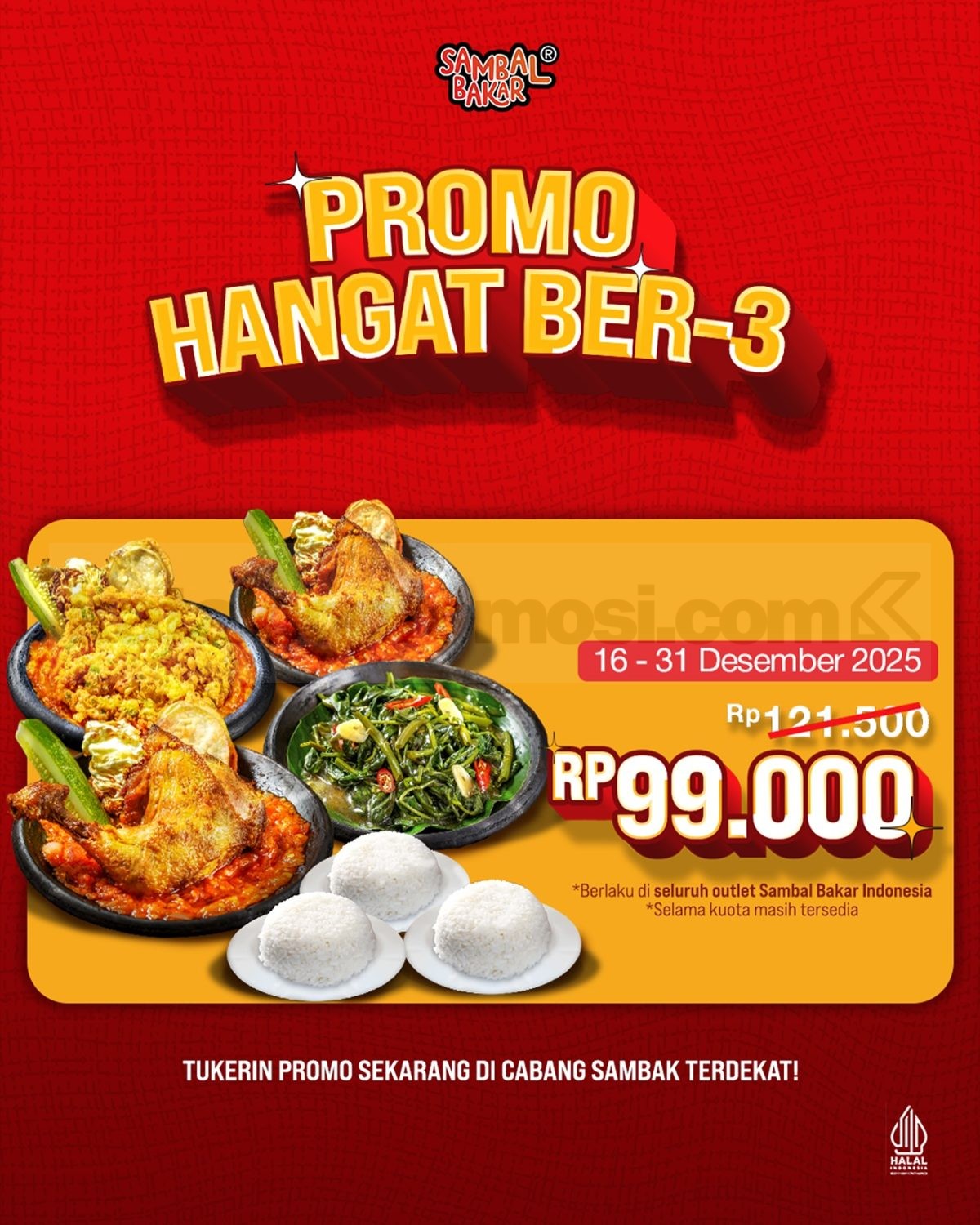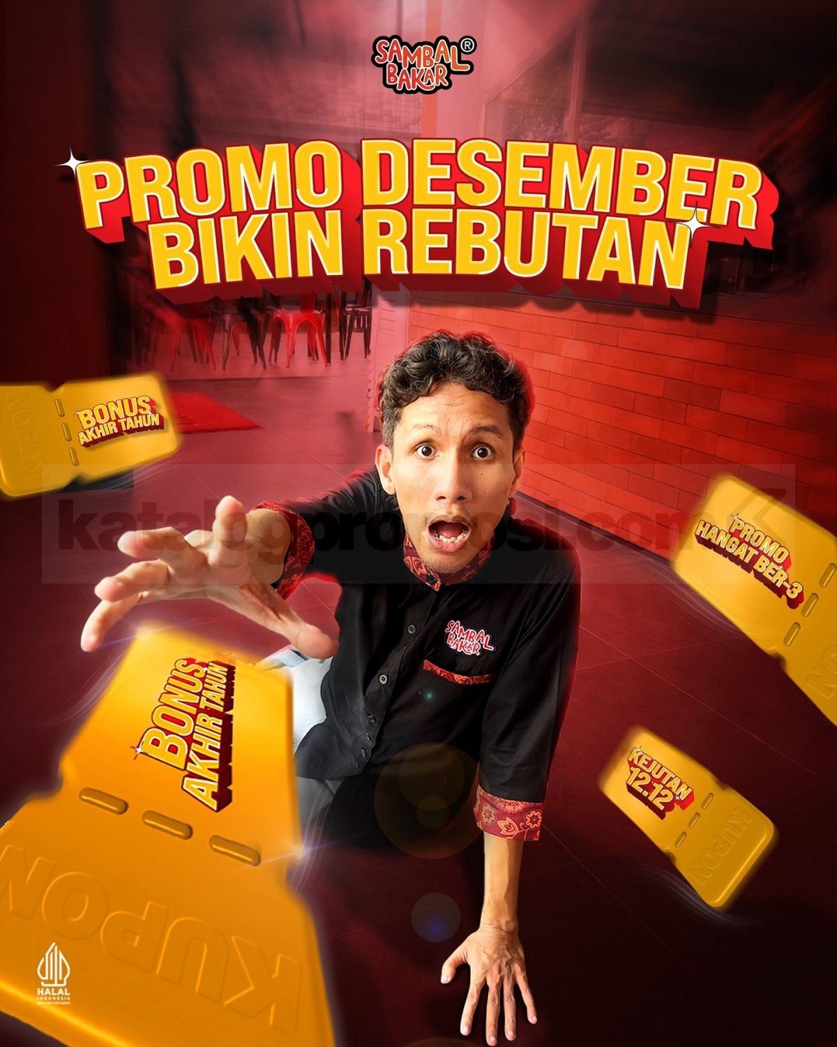SAMBAL BAKAR lagi bagi-bagi promo Desember yang bikin semua orang rebutan! Mulai dari penawaran hemat Rp. 12.000, bonus dessert spesial untuk para pekerja kantor, sampai paket bertiga yang lebih ekonomis, semuanya hadir sepanjang bulan ini untuk kamu yang doyan menu pedas dan gurih khas Sambal Bakar Indonesia.