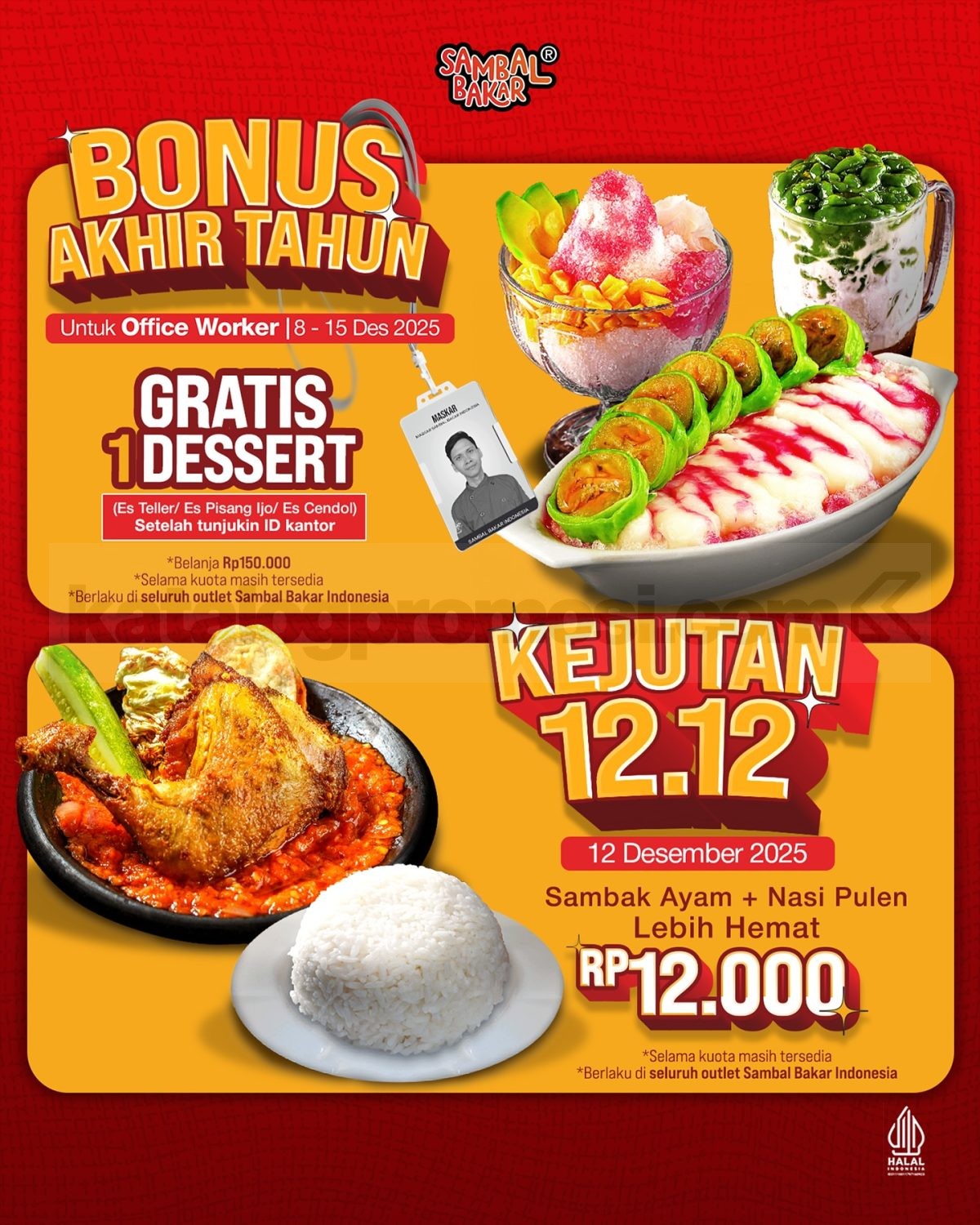 Promo Sambal Bakar Desember Bikin Rebutan mulai Rp. 12.000 dengan bonus dessert untuk office worker dan paket hemat, berlaku 8 Desemberโ€“31 Desember 2025 di seluruh outlet.