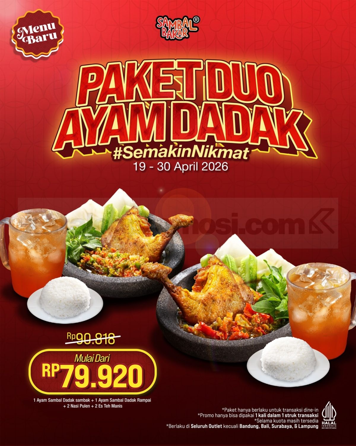 Promo Sambal Bakar Paket Duo Ayam Dadak Rp.79.920 berlaku tanggal 19 – 30 April 2026 selama periode program berlangsung di outlet Sambal Bakar yang berpartisipasi sesuai ketentuan promo.