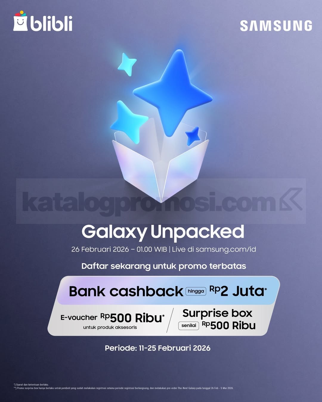 Promo Samsung Galaxy Unpacked e-Voucher & Surprise Box + Bank Cashback hingga Rp. 2.000.000 berlaku 11 Februari – 25 Februari 2026.