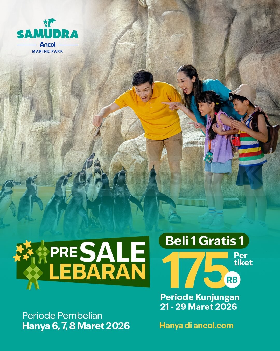 Sambut momen Lebaran 2026 lewat liburan keluarga yang lebih hemat di Samudra Ancol. Program Presale THR Lebaran membuka kesempatan masuk area rekreasi ini lewat promo beli 1 GRATIS 1 tiket.
