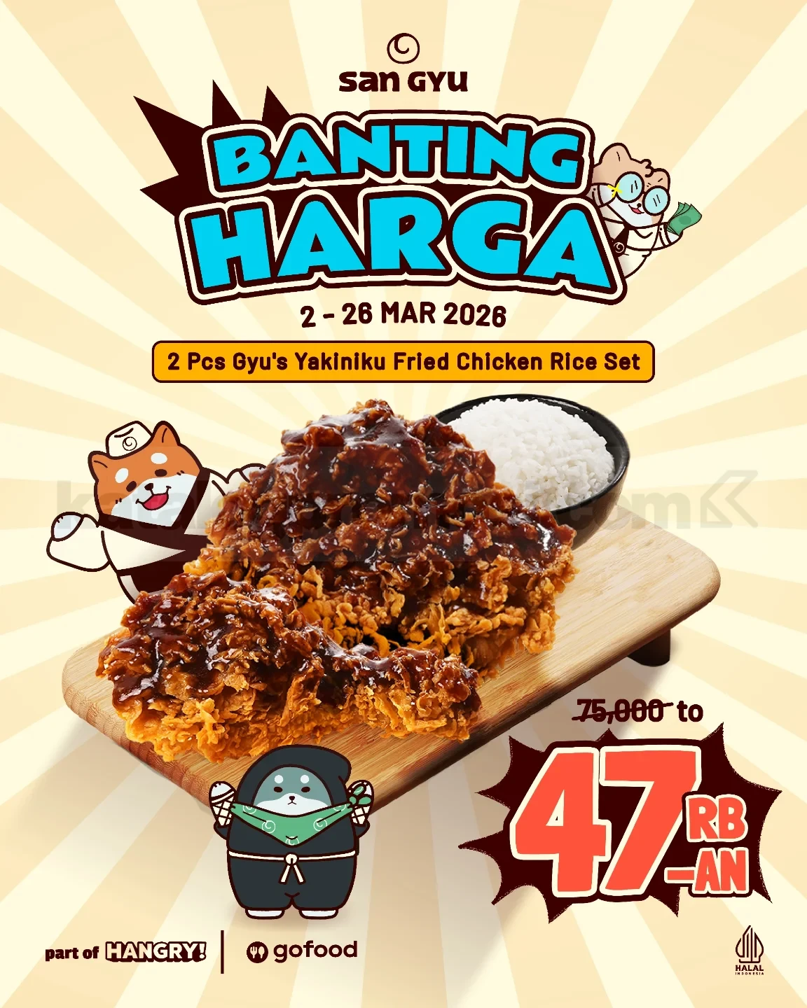Promo San Gyu 2 Yakiniku Fried Chicken Rice Set Rp. 47 ribuan berlaku selama periode 2 Maret sampai 26 Maret 2026 dan bisa dipesan dengan mudah melalui aplikasi GoFood. Jadi kamu bisa menikmati menu favorit San Gyu tanpa perlu keluar rumah.